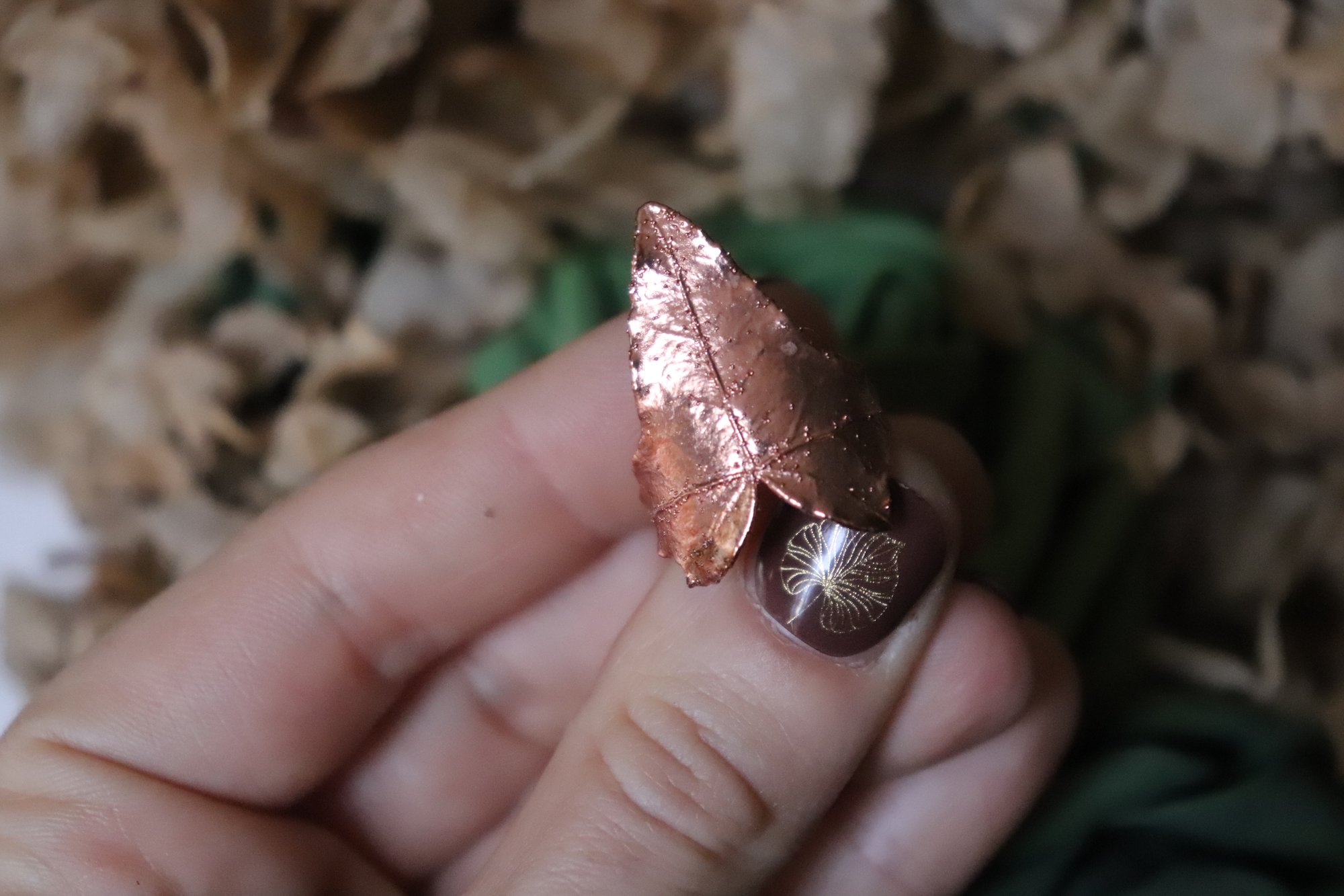Anello con vera foglia di edera elettroformata in rame con finitura lucida, taglia 12