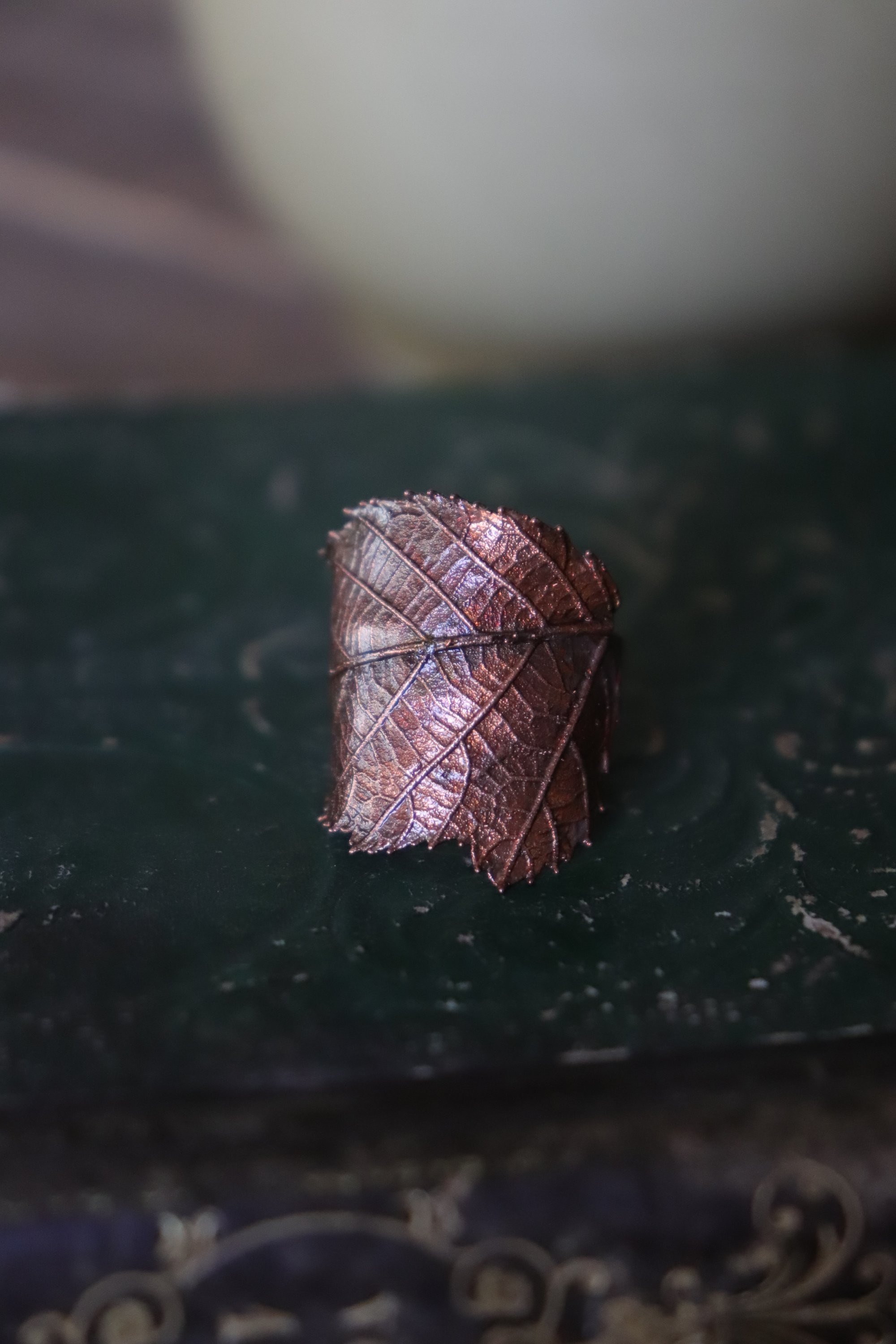 Anello con vera foglia di rovo fissata su base ad anello, non regolabile, alta 5 mm ed elettroformata in rame, con finitura ossidata e venature in risalto.