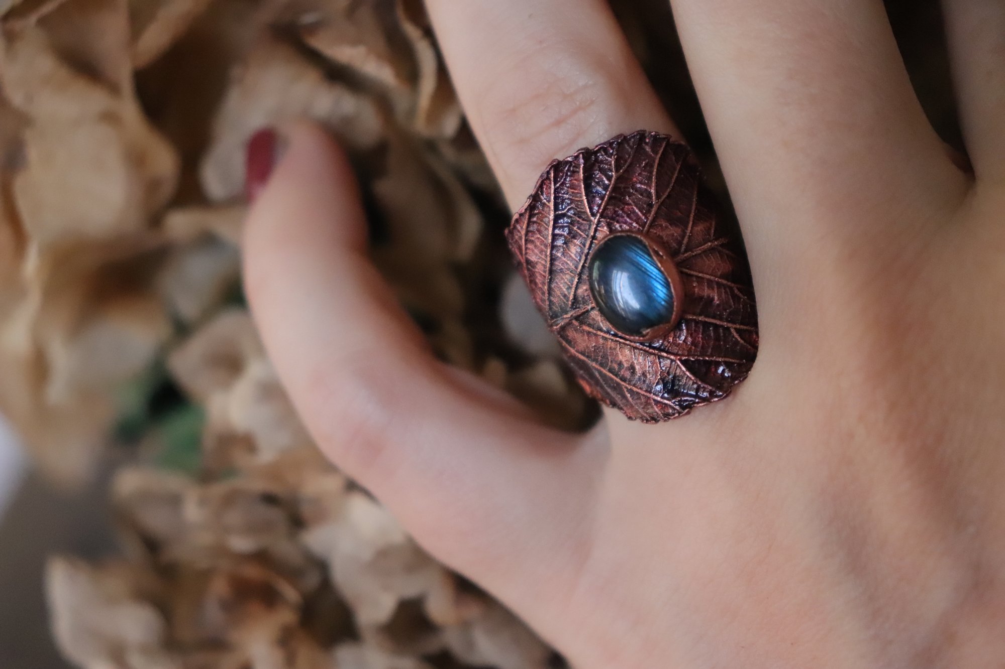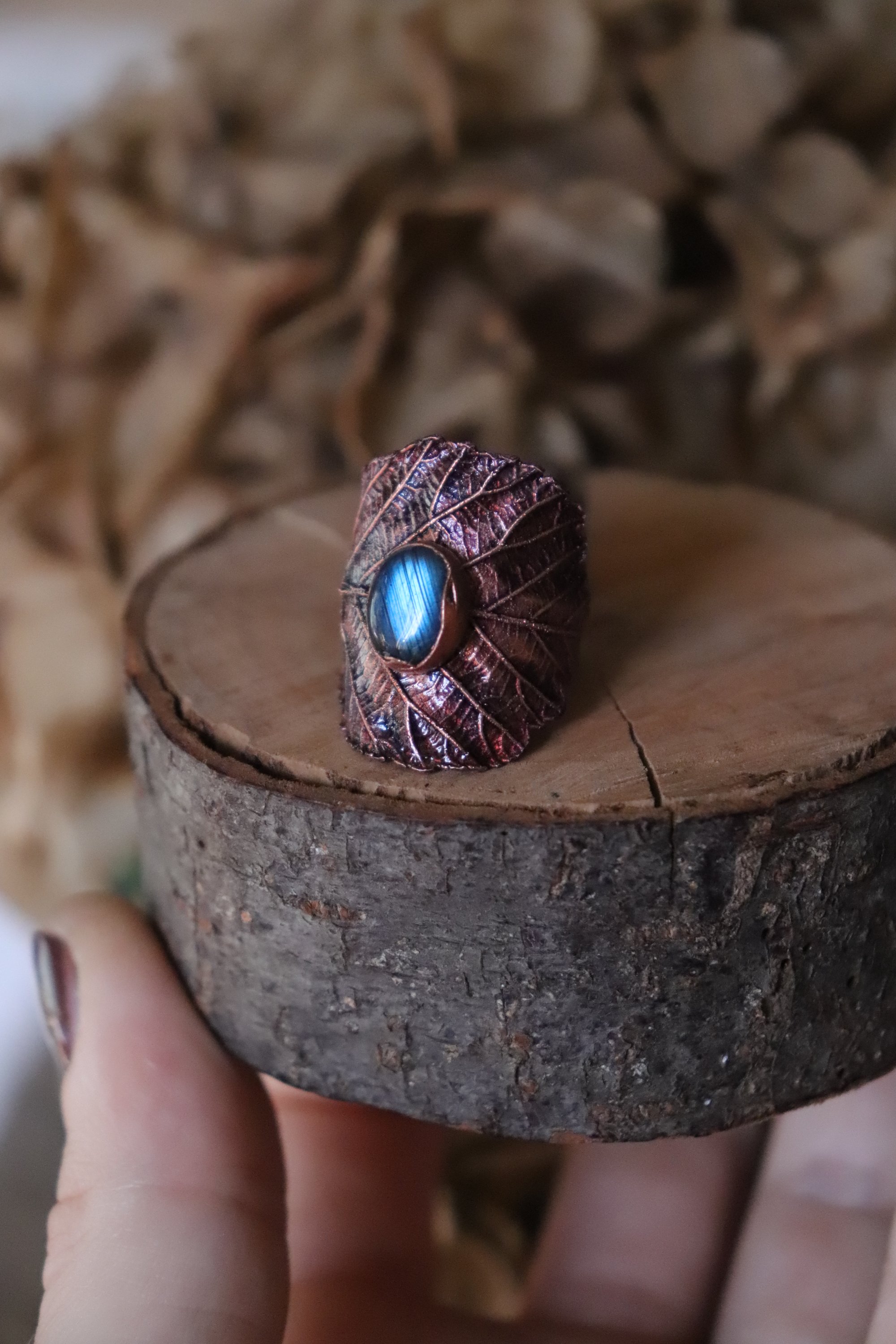 Anello con vera foglia di rovo in rame con labradorite e patina viola, taglia 12