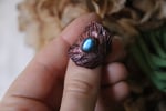 Anello con vera foglia di rovo fissata su base ad anello, non regolabile, alta 5 mm ed elettroformata in rame, con finitura leggermente ossidata e patina dipinta viola scuro con venature in risalto. All'anello è applicata una gemma di labradorite blu.
