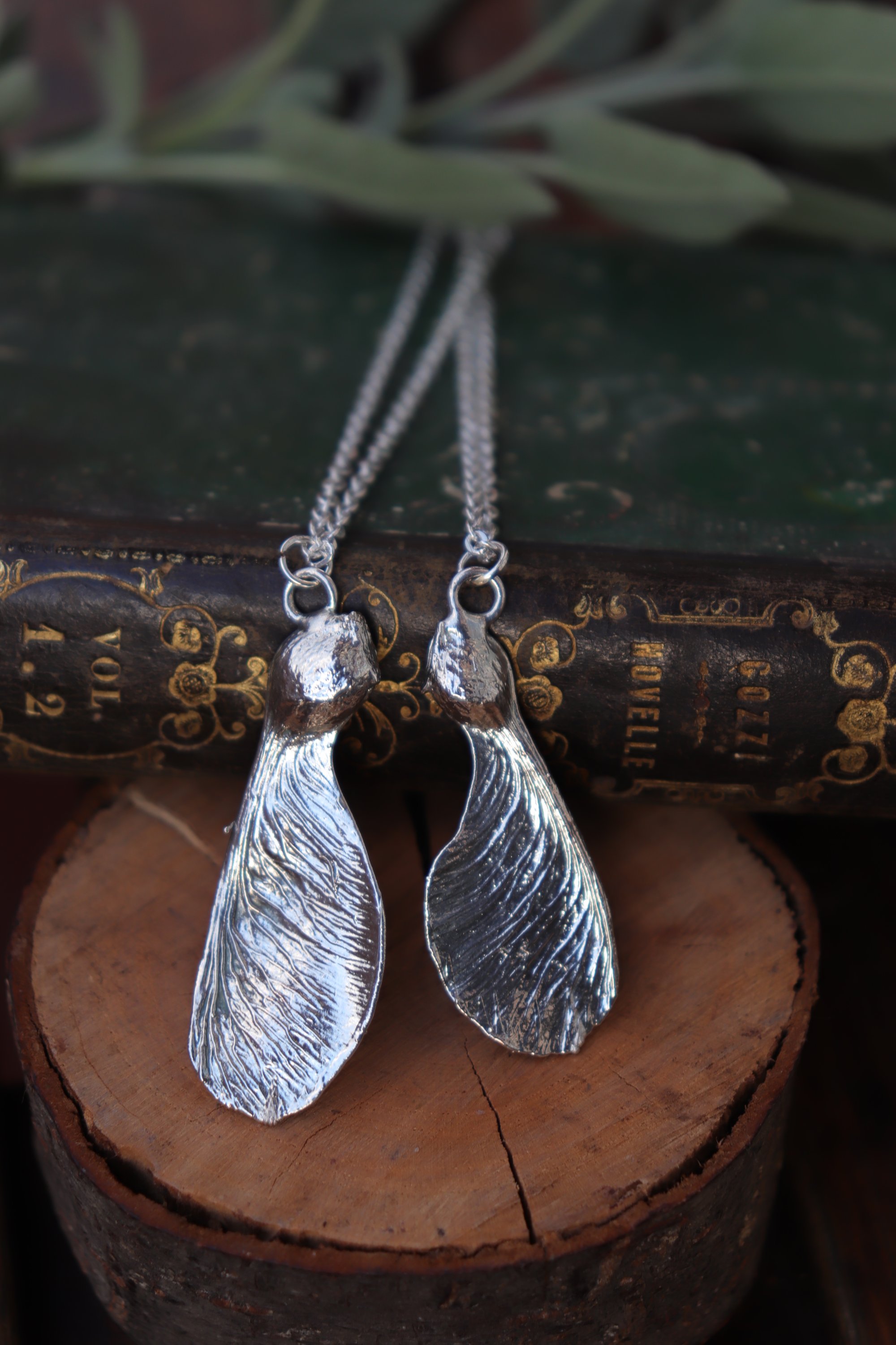 Questi ciondoli sono stati creati partendo dalle due metà di una stessa disamara di acero sicomoro, contenuta al loro interno, rivestiti prima di rame mediante elettroformatura e successivamente placcati in puro argento, dalla finitura brillante.
