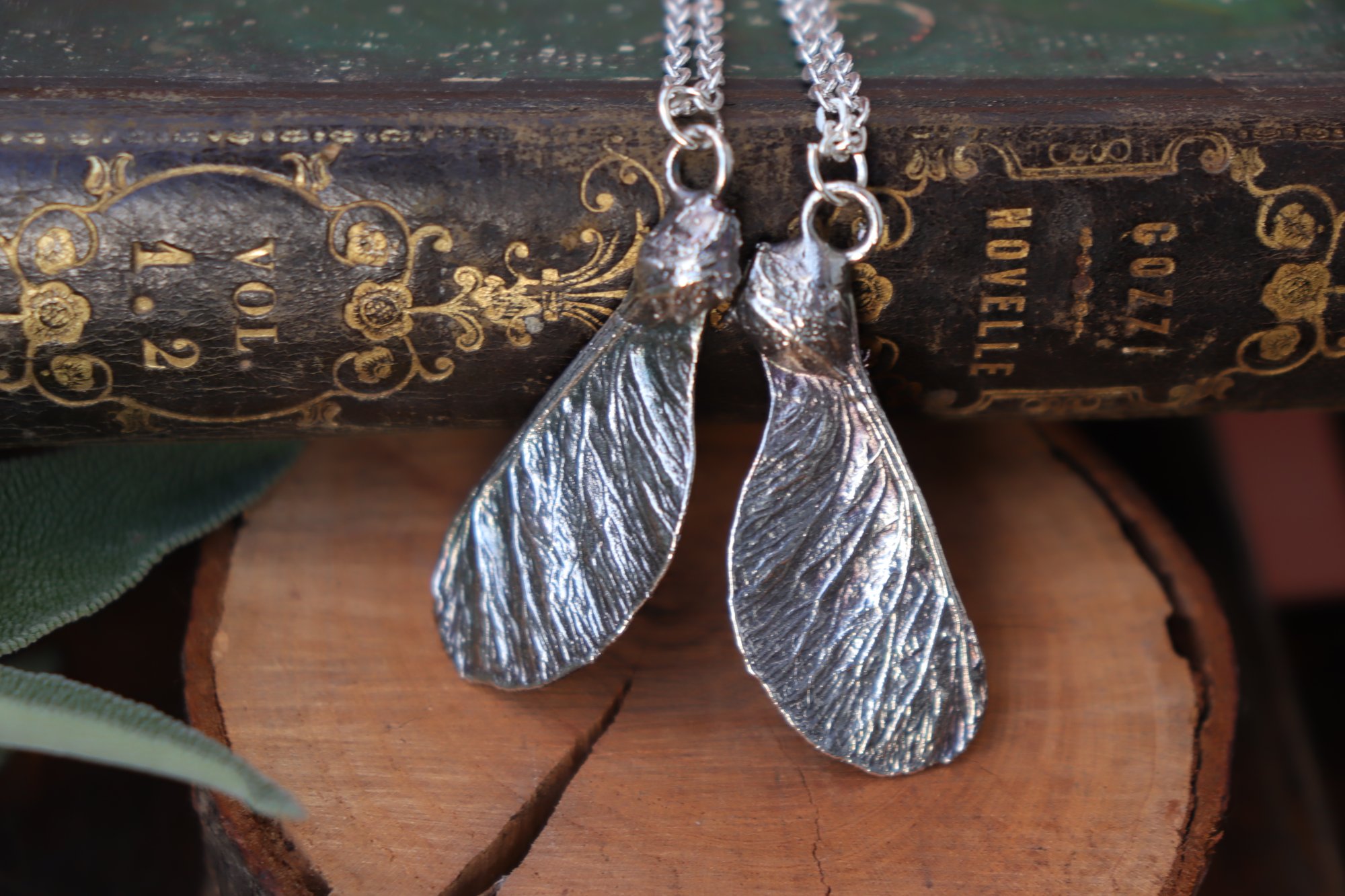 Questi ciondoli sono stati creati partendo dalle due metà di una stessa disamara di acero sicomoro, contenuta al loro interno, rivestiti prima di rame mediante elettroformatura e successivamente placcati in puro argento, dalla finitura brillante.