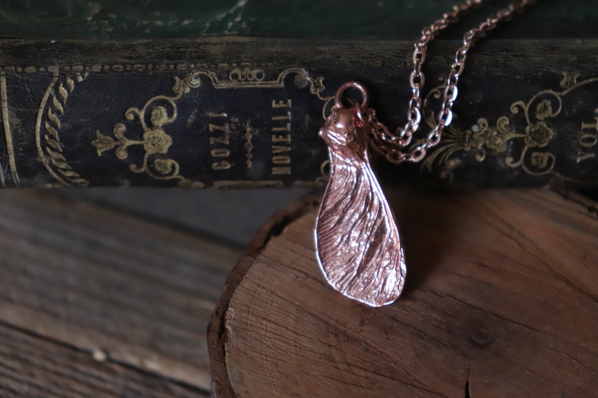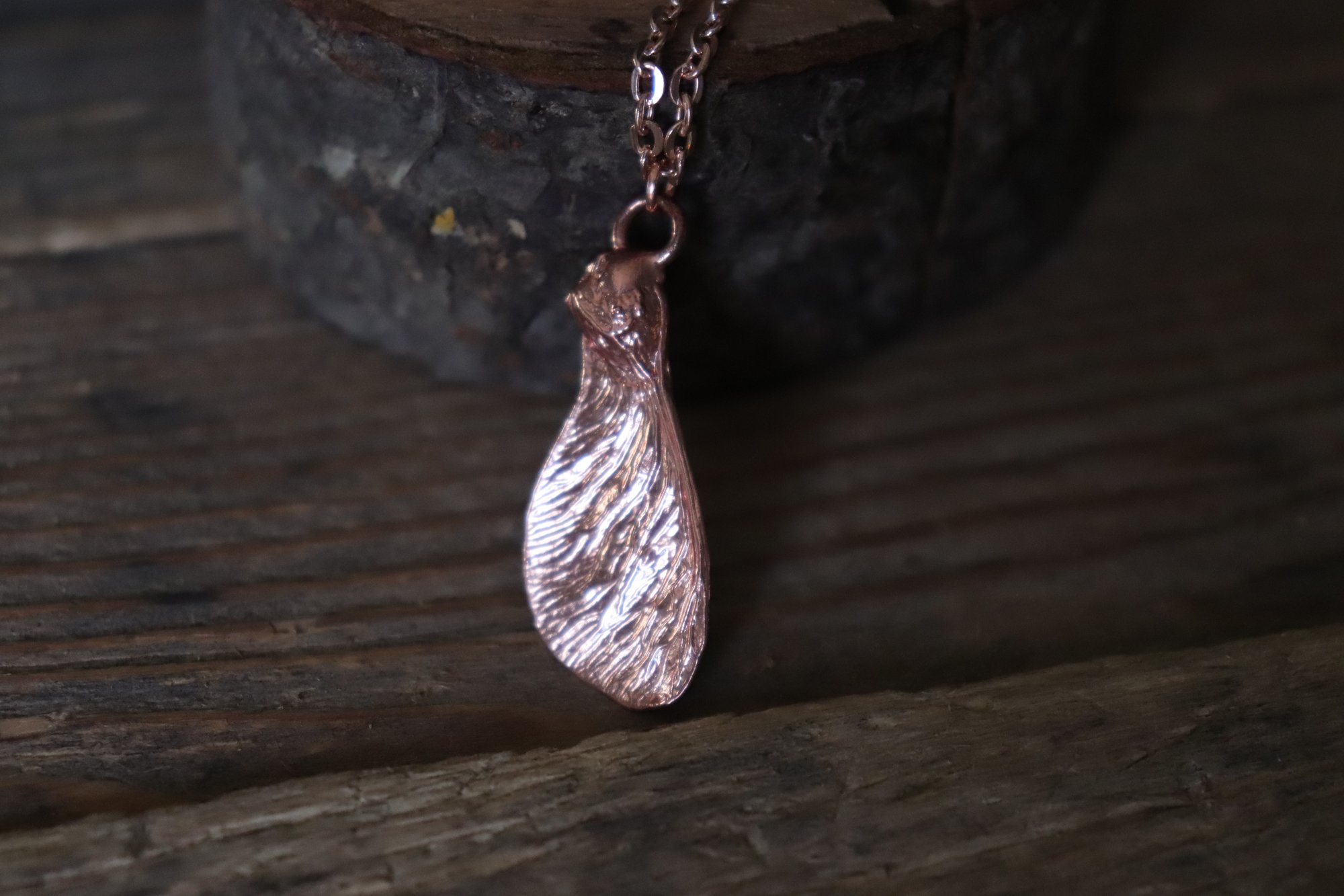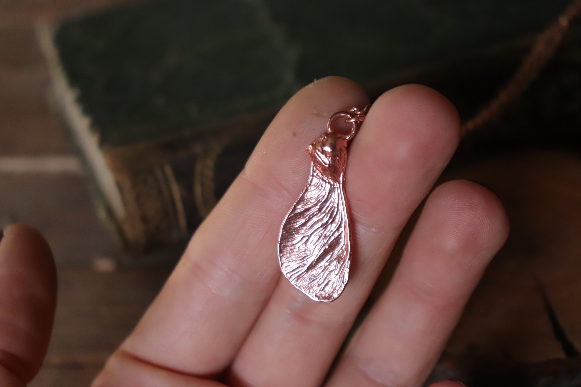 Questo gioiello unico è stato creato partendo dalla metà di una vera samara di acero, contenuta al suo interno e rivestita di rame mediante elettroformatura. la finitura è lucida e il tutto protetto successivamente per prevenire ulteriore ossidazione.