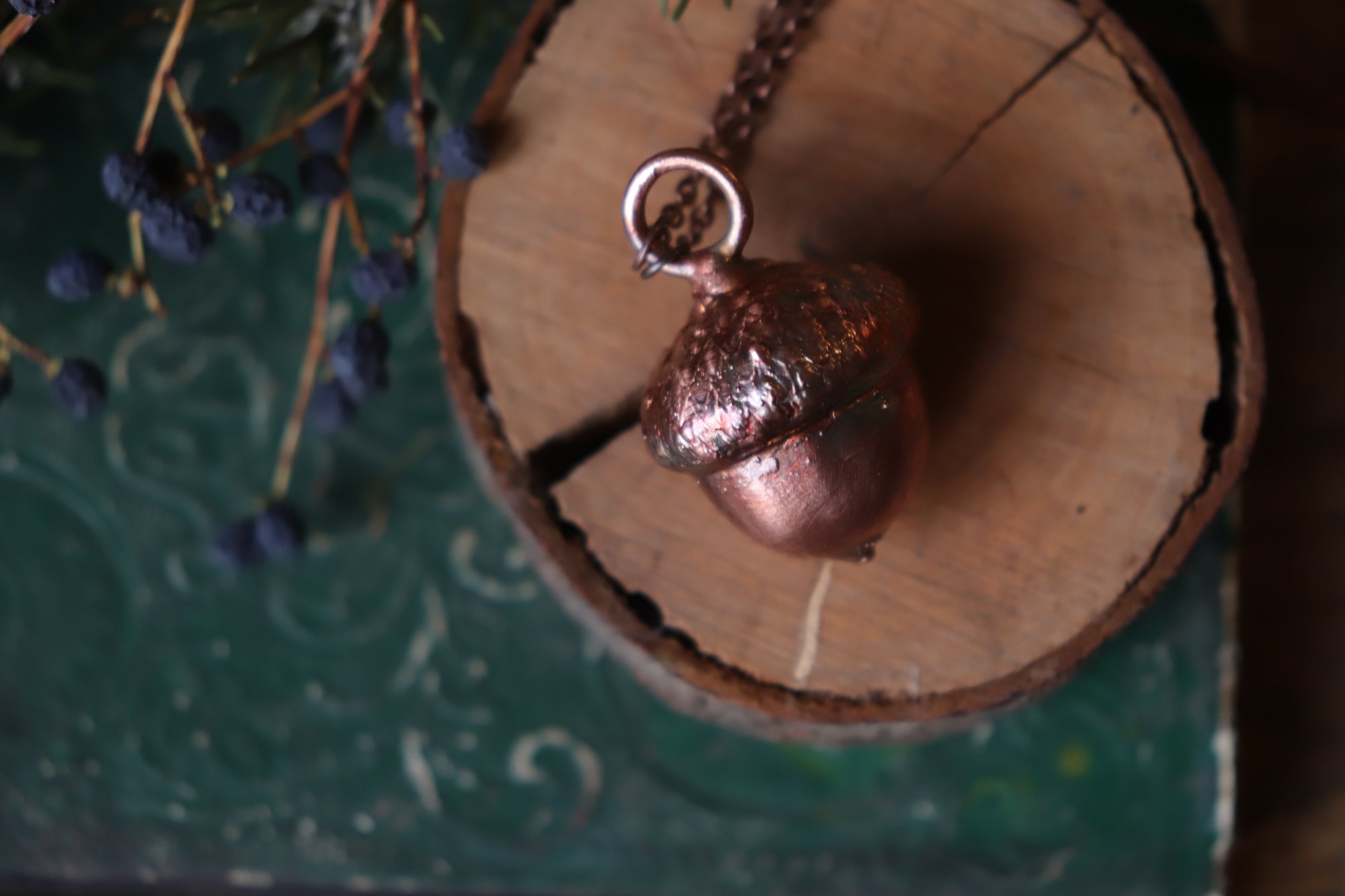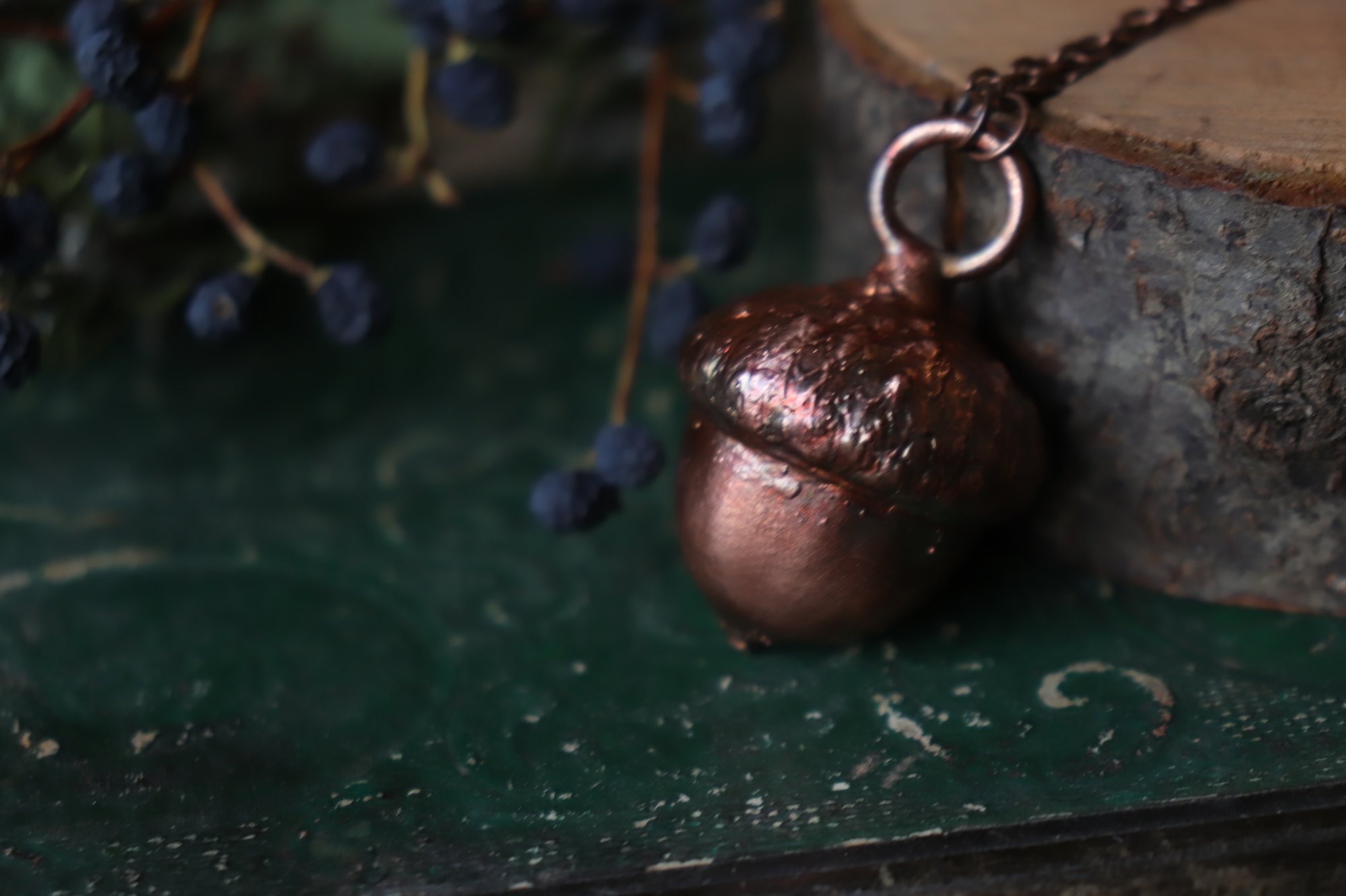 Questo ciondolo contiene una vera ghianda, elettroformata in rame e ossidata e lucidata per risaltare la sua forma naturale.