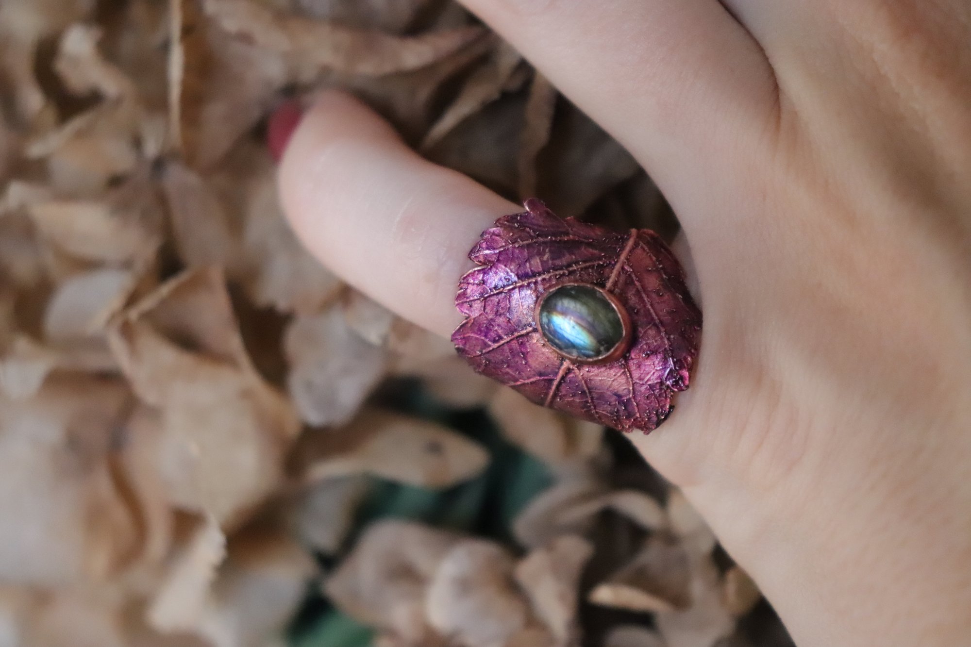 Anello con vera foglia di rovo in rame con labradorite e patina viola, taglia 9/10