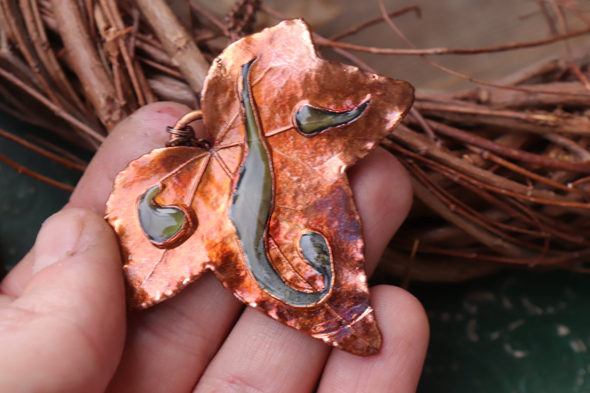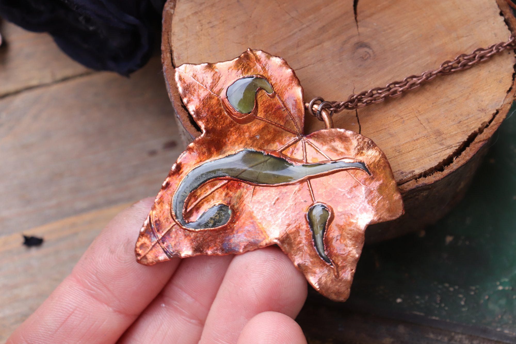 Questo gioiello unico è stato creato partendo da una vera foglia di edera, contenuta al suo interno, e rivestita di rame mediante elettroformatura, con tre finestre di resina di diverse dimensioni e forme più a scoprire le venature sottostanti.