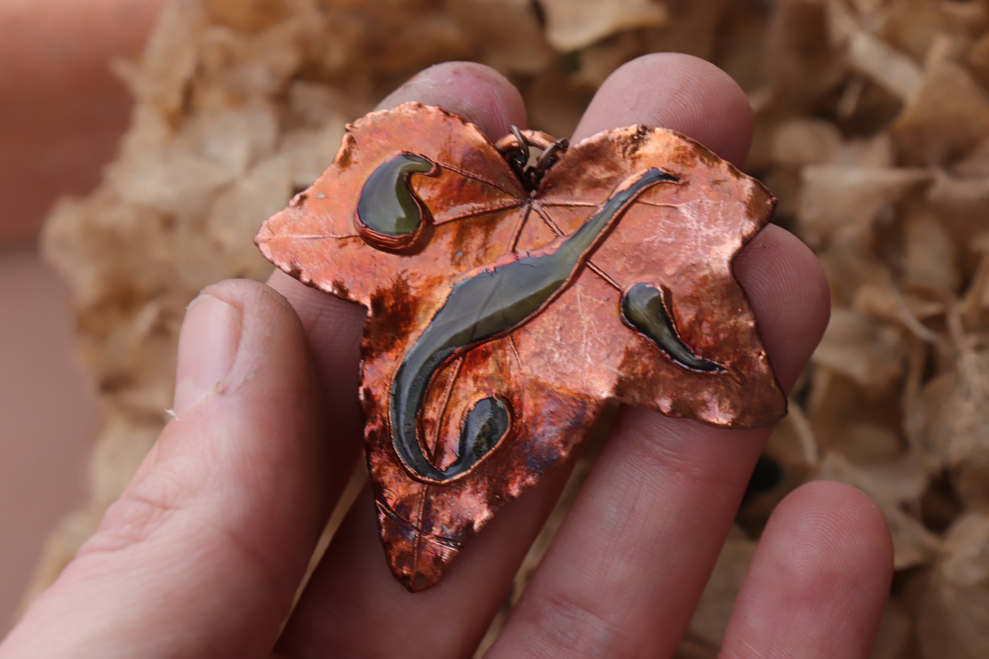 Interpretare questo concetto attraverso il gioiello e nello specifico questa tecnica, mi ha portata a "scoprire" parti di foglie, di venature, di colori naturali, risparmiandoli dall'abbraccio del rame e proteggendoli con gocce di resina trasparente, per fare in modo che non si danneggiassero.