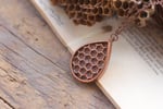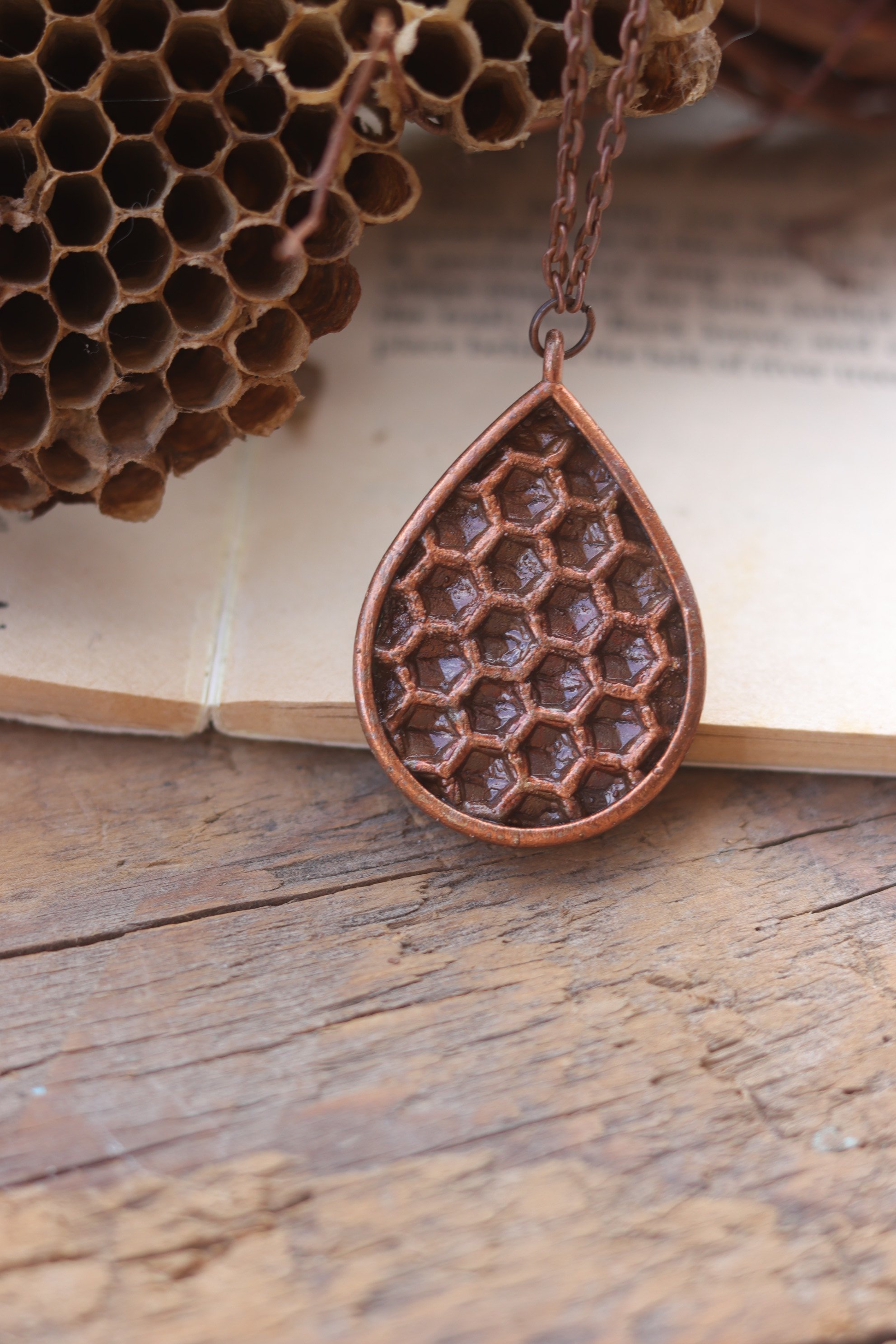 Questo gioiello unico è stato creato partendo da una vero frammento di alveare in cera, contenuto al suo interno, e rivestito di rame mediante elettroformatura.