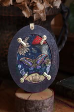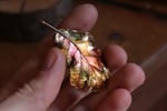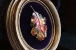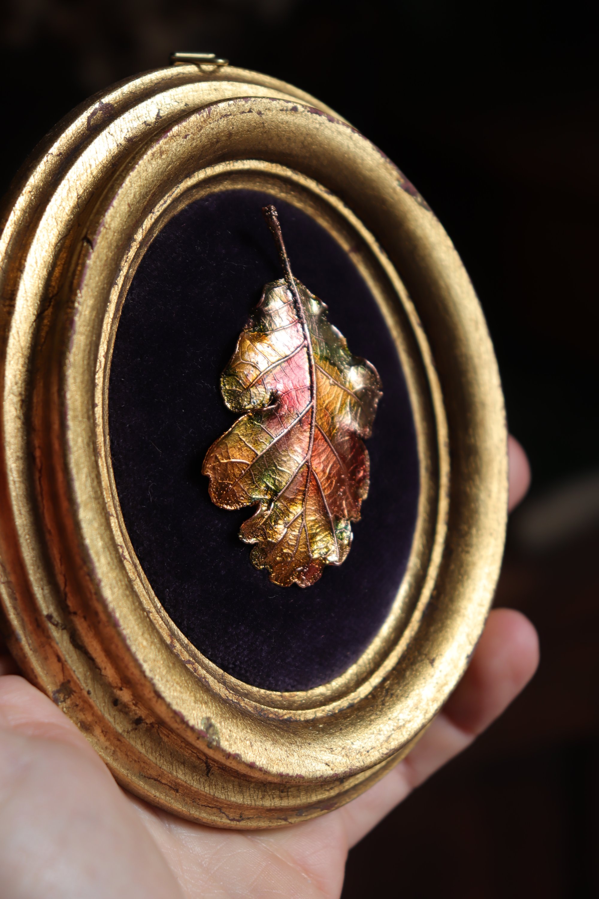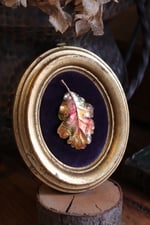 La foglia è ancorata al velluto viola della cornice per mezzo di un magnete, che la rende una spilla indossabile!