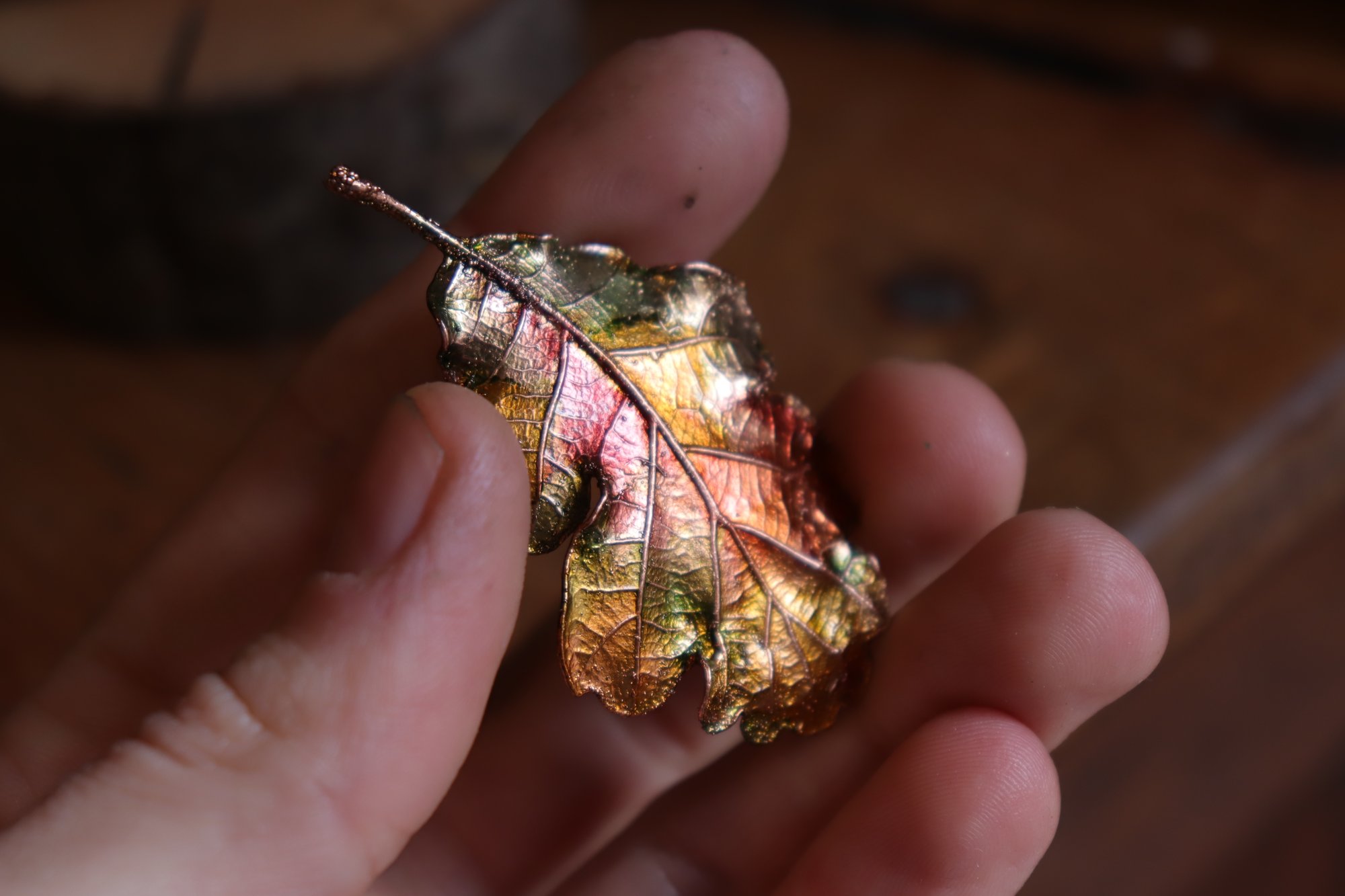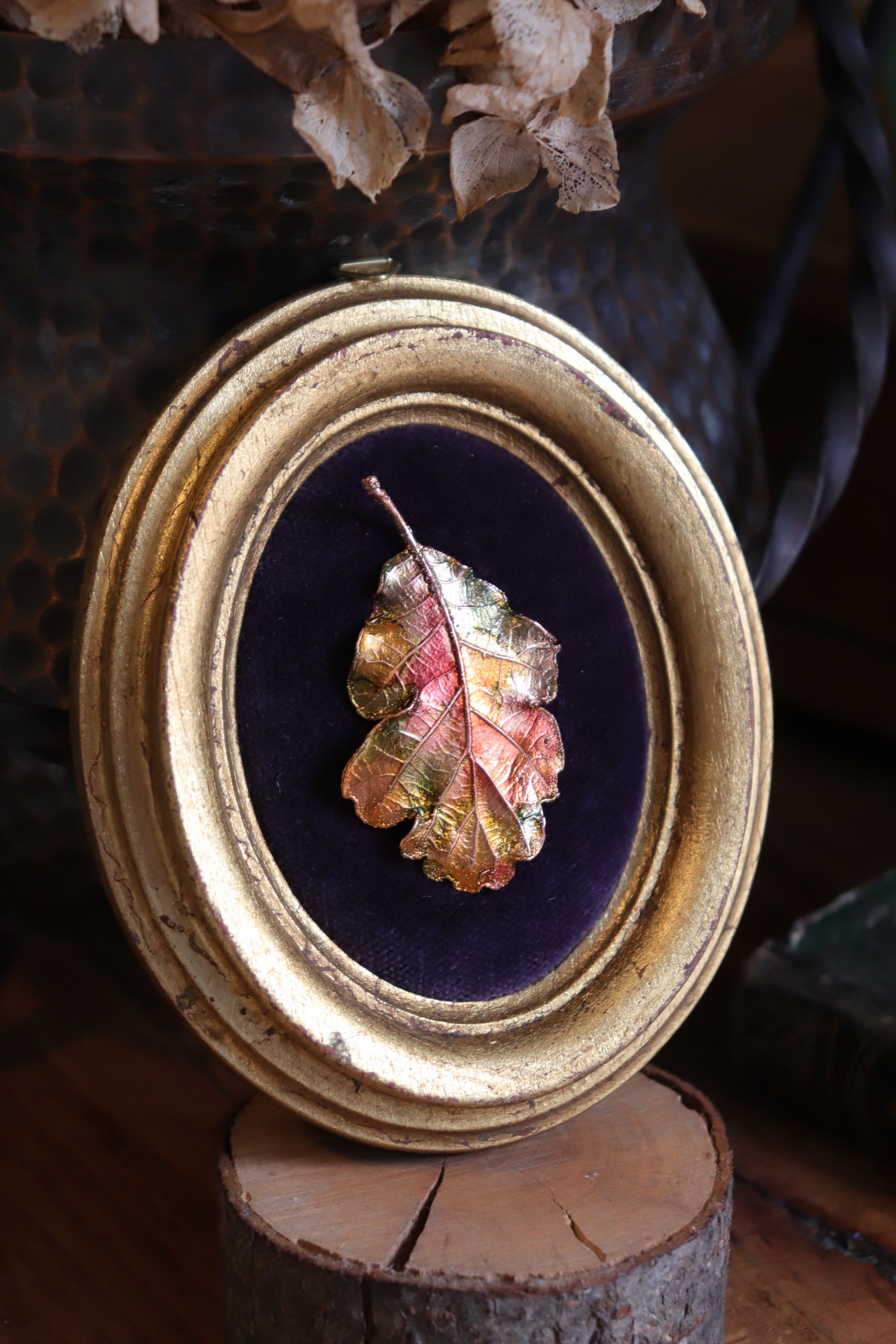 Cornice 11 in legno dorato con spilla foglia di quercia in rame e retro dark botanico/sottobosco