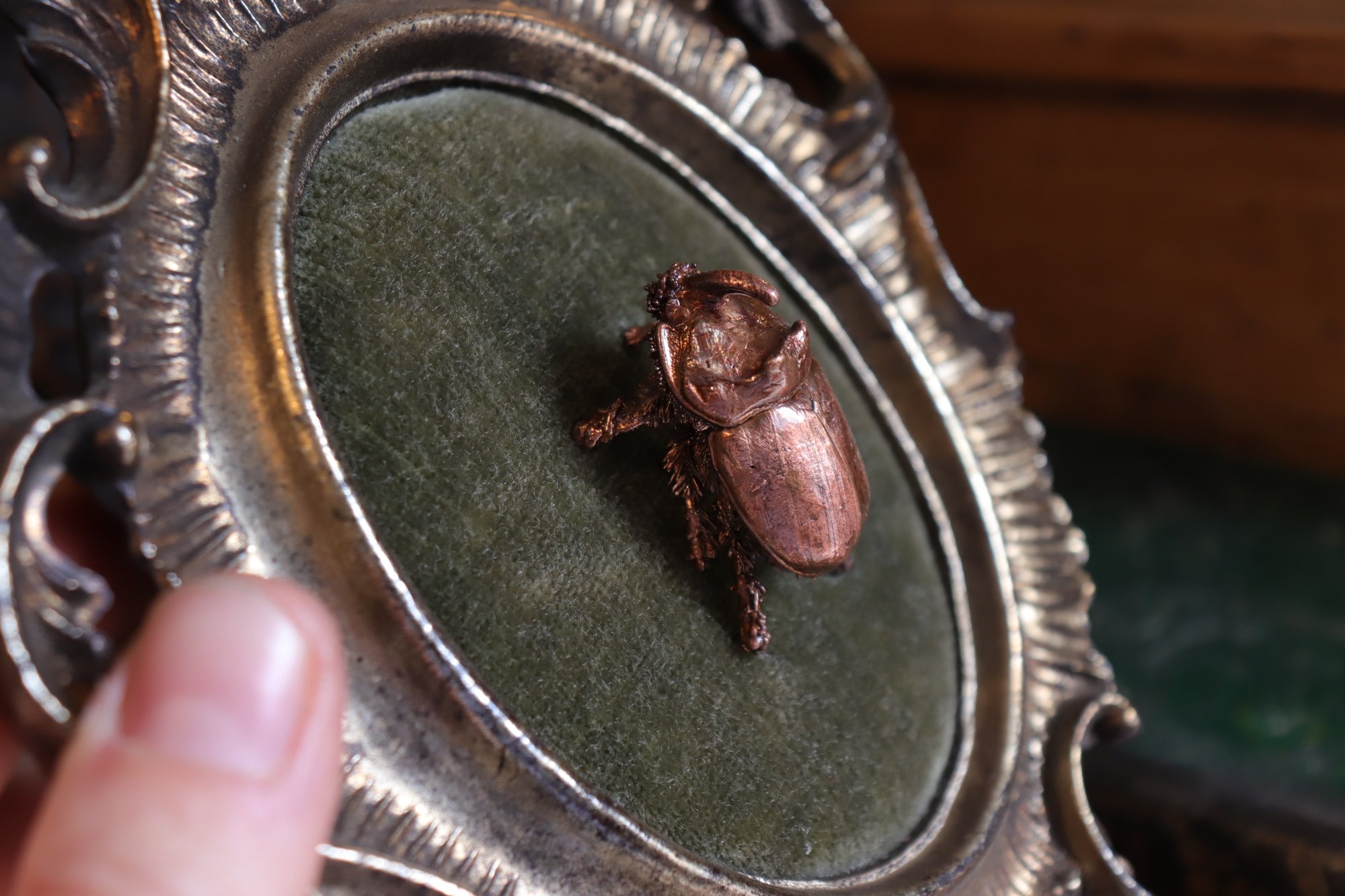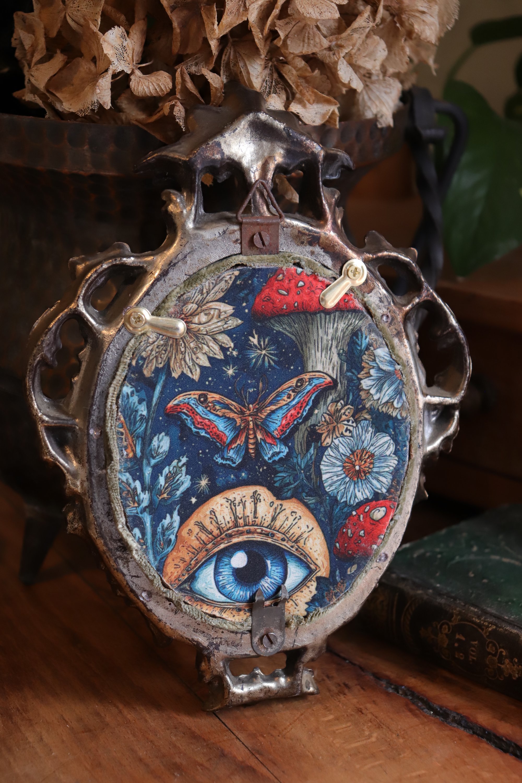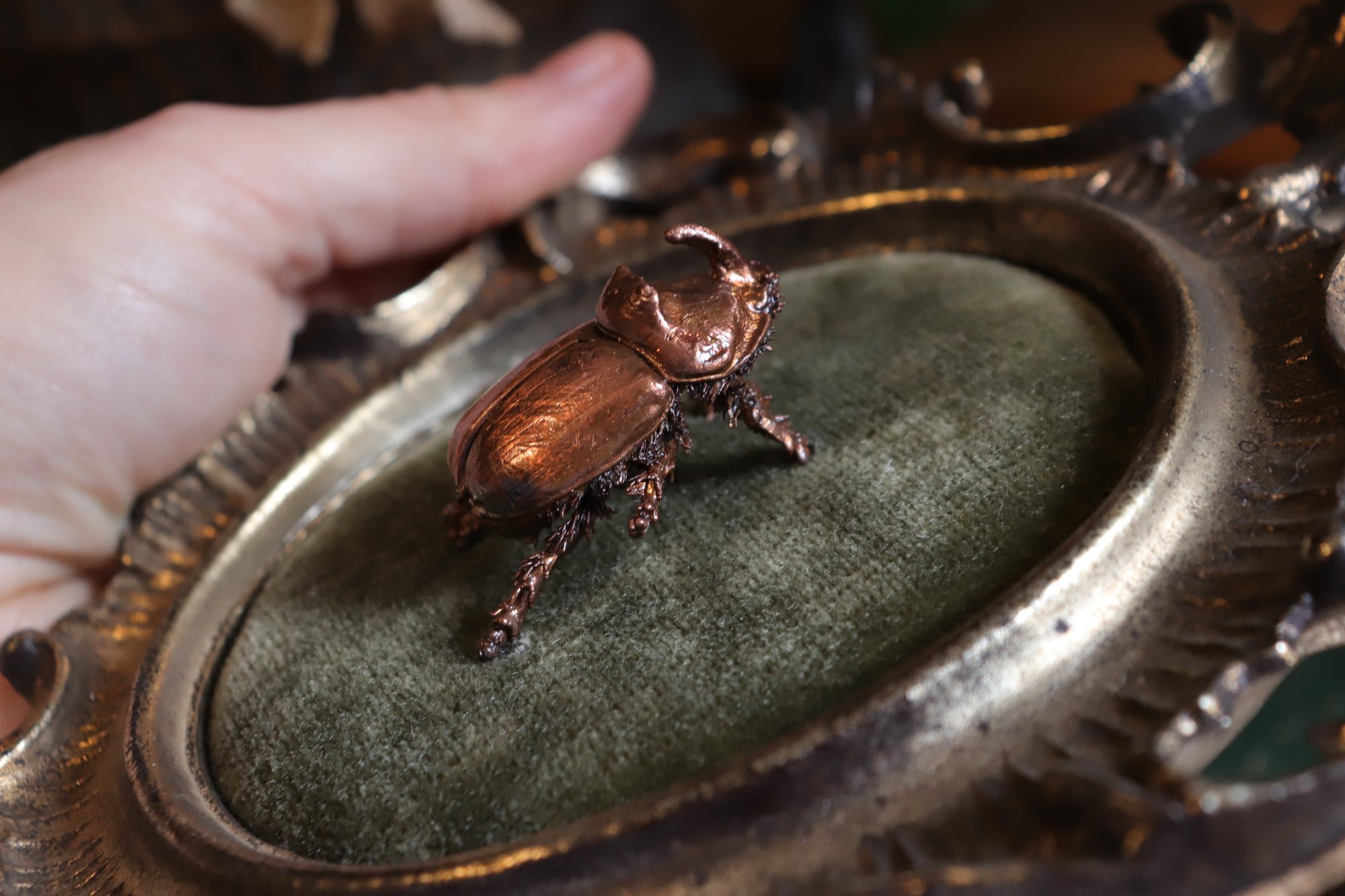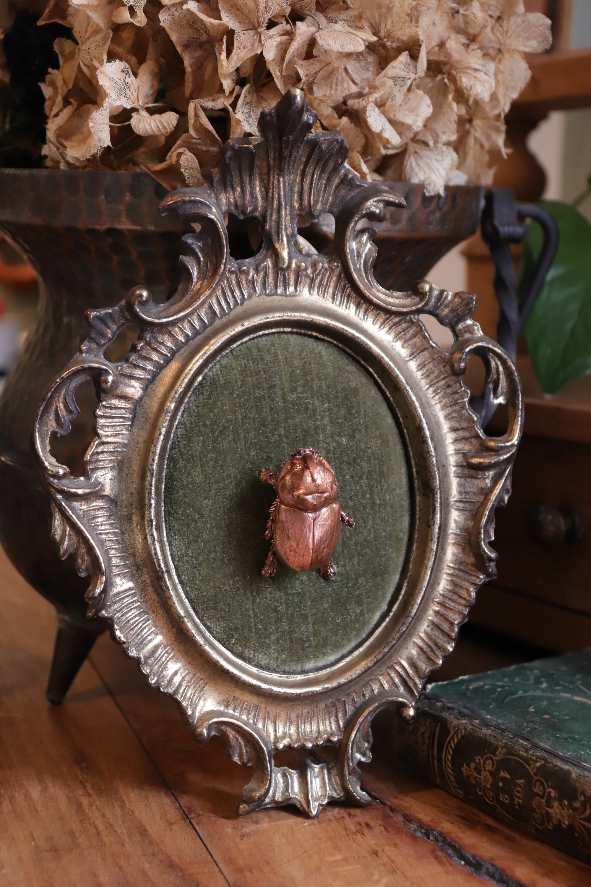 Questa cornice vintage realizzata con materiale plastico a colata e poi dipinta, restaurata e con applicata sul retro una stoffa in stile dark botanico (con elementi botanici astratti su fondo blu scuro, fungo, farfalla e occhio),è diventata la casa di "Gustave": uno scarabeo rinoceronte (già trovato morto in natura) rivestito di rame mediante elettroformatura.