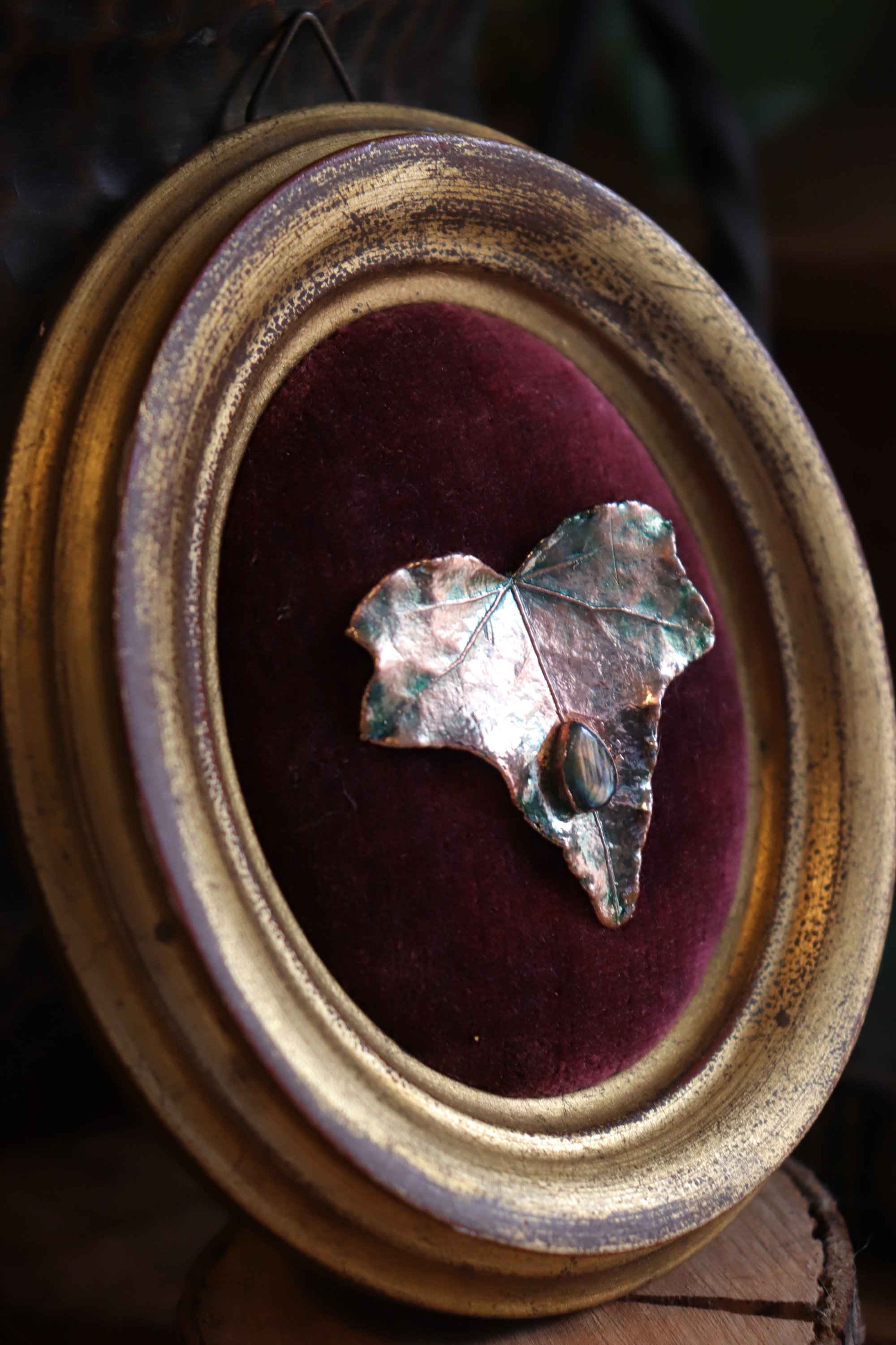 La foglia è ancorata al velluto bordeaux della cornice per mezzo di un magnete, che la rende una spilla indossabile!