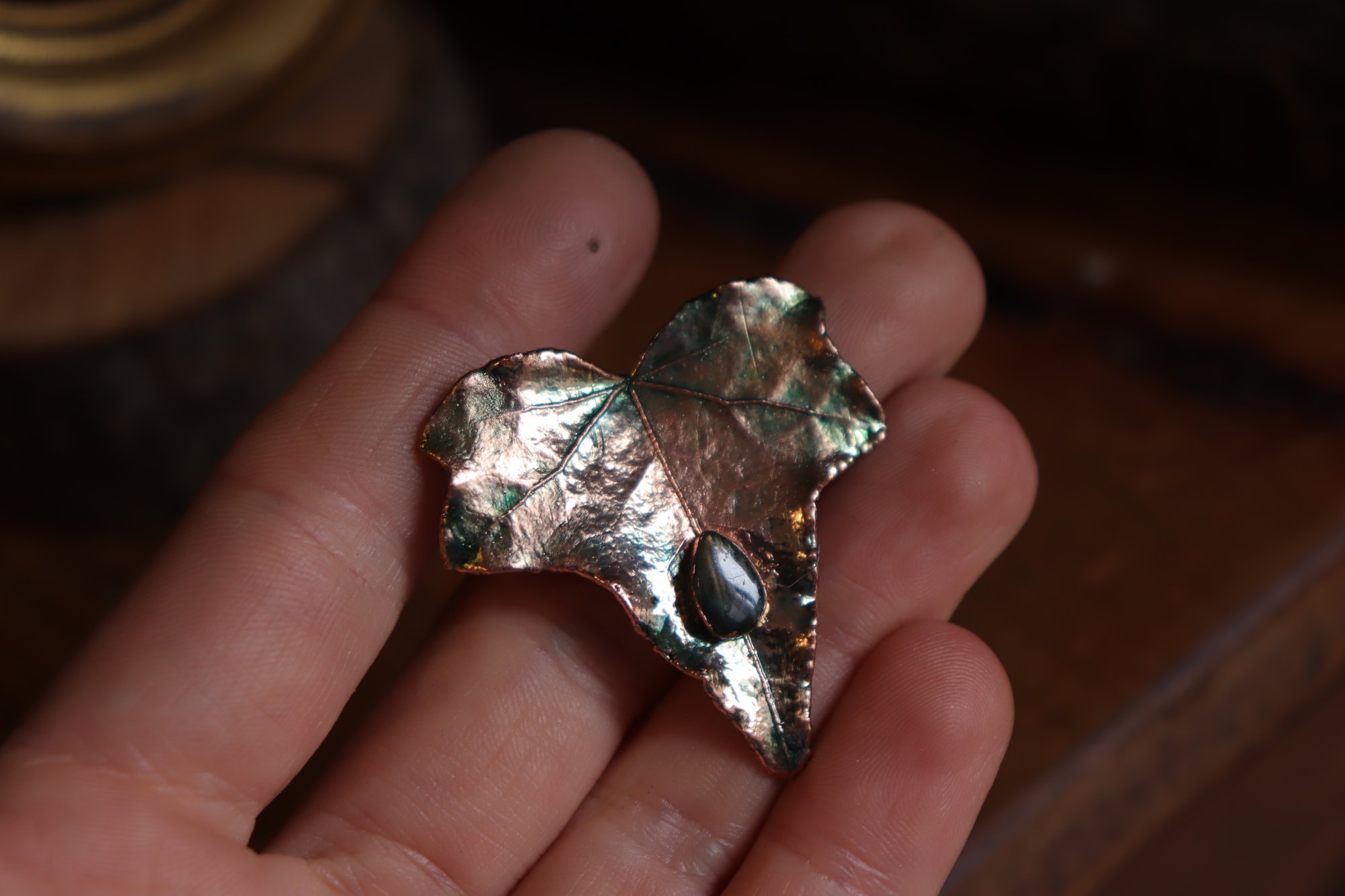 Cornice 2 dorata con spilla foglia di edera e labradorite in rame e retro "dark botanico spooky"
