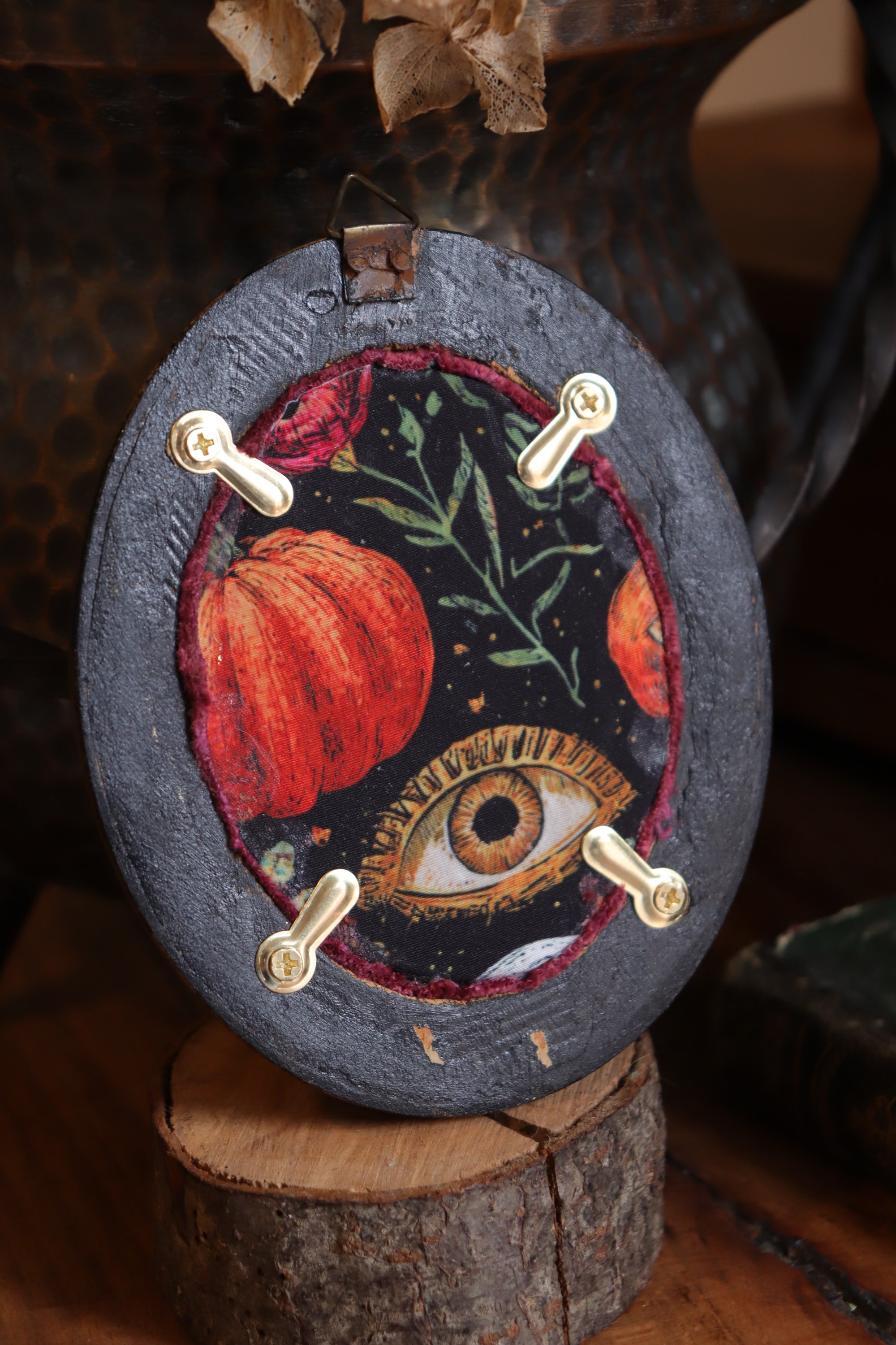 Questa cornice d'antiquariato in legno dorato, restaurata e con applicata sul retro una stoffa in stile dark botanico dal tocco più stregato/autunnale (occhio, zucca e elemento botanico), racchiude una foglia di edera elettroformata in rame, con finitura lucida e patina sfumata verde con abbinata una labradorite a goccia.