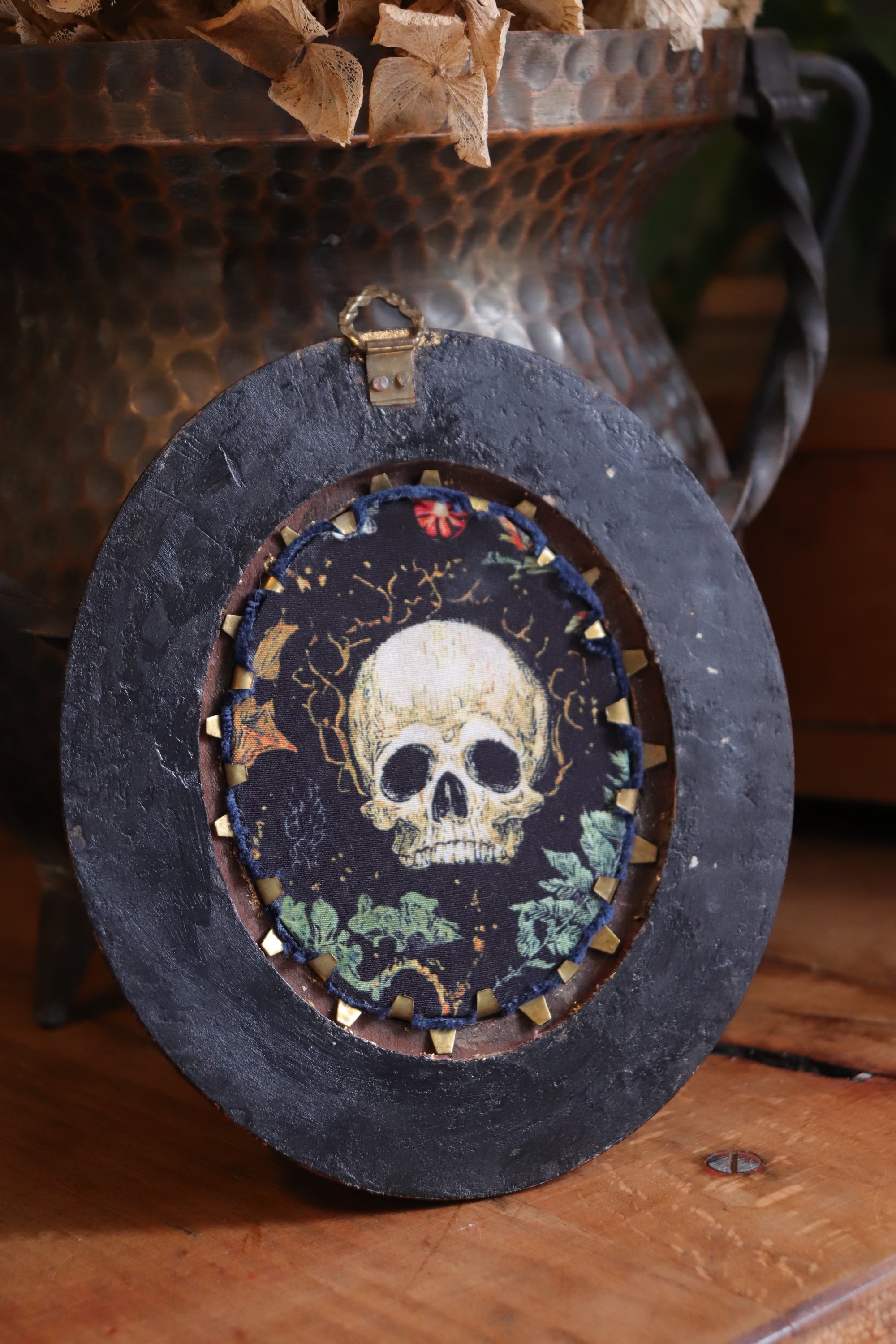 Questa cornice d'antiquariato in legno dorato, restaurata e con applicata sul retro una stoffa in stile dark botanico che raffigura un teschio, racchiude una foglia di rovo elettroformata in rame con finitura di base ossidata e patina dipinta dai toni autunnali.