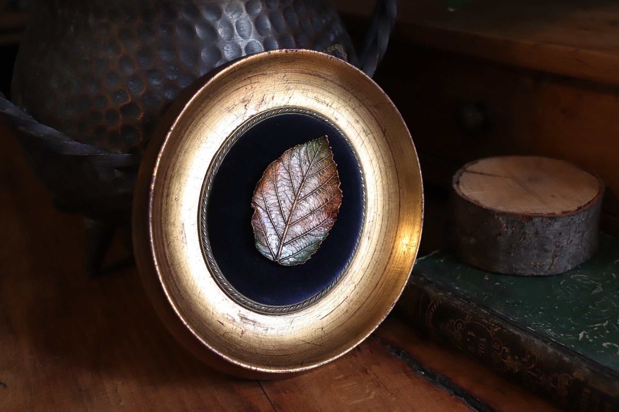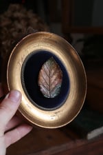 Questa cornice antica, così come la foglia-spilla, è un pezzo unico, nato dall'idea di unire la passione per l'antiquariato e il restauro con quella del gioiello botanico, per dare vita ad una collezione capace di soddisfare anche le/gli amanti dell'home decor in stile "Masca" :D