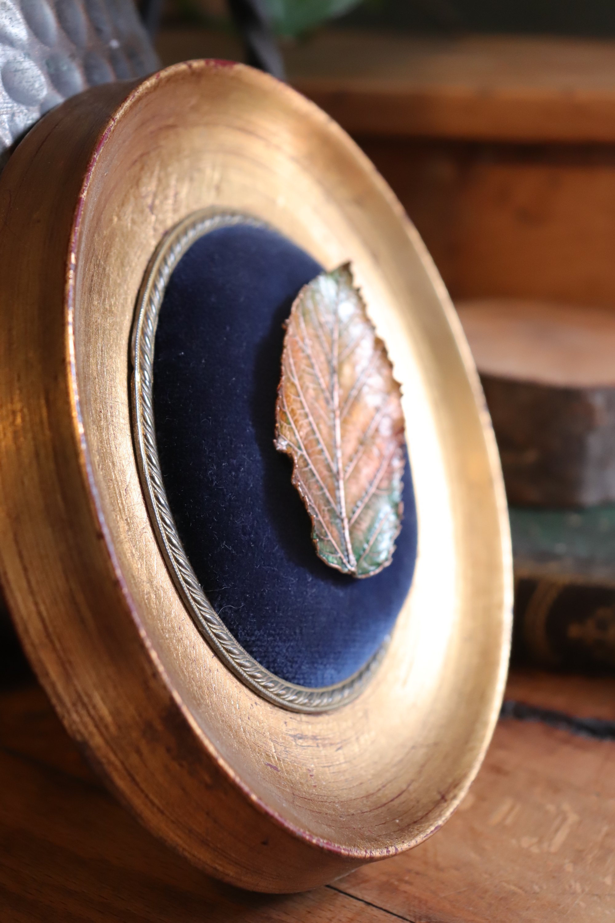 La foglia è ancorata al velluto blu della cornice per mezzo di un magnete, che la rende una spilla indossabile!