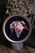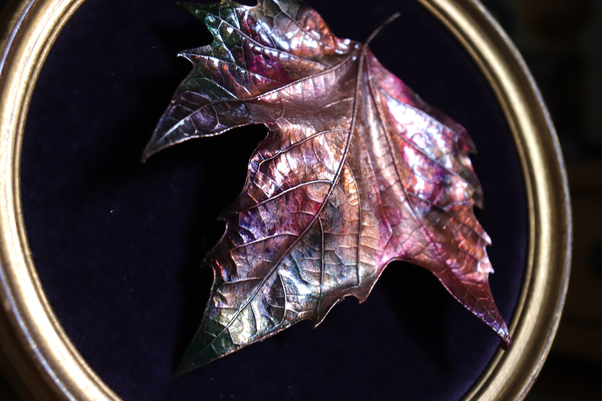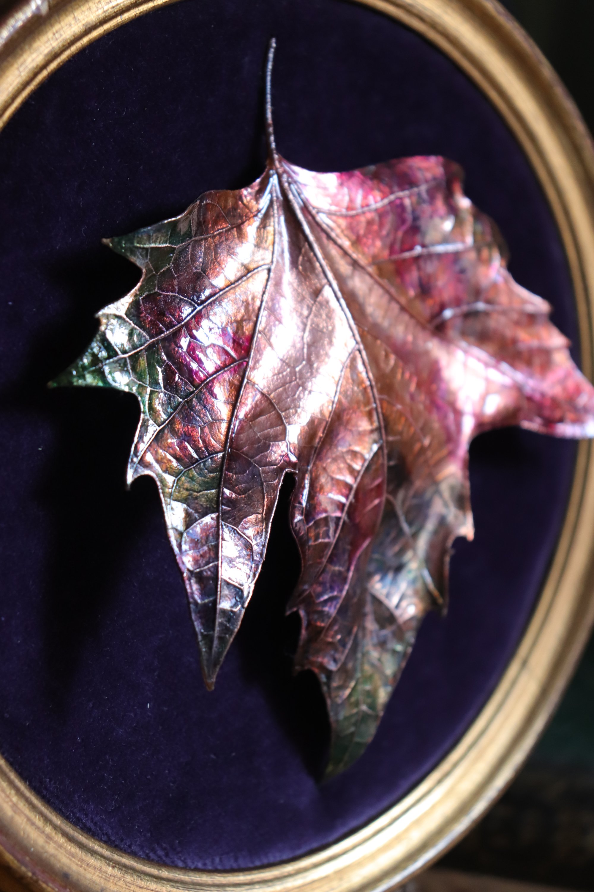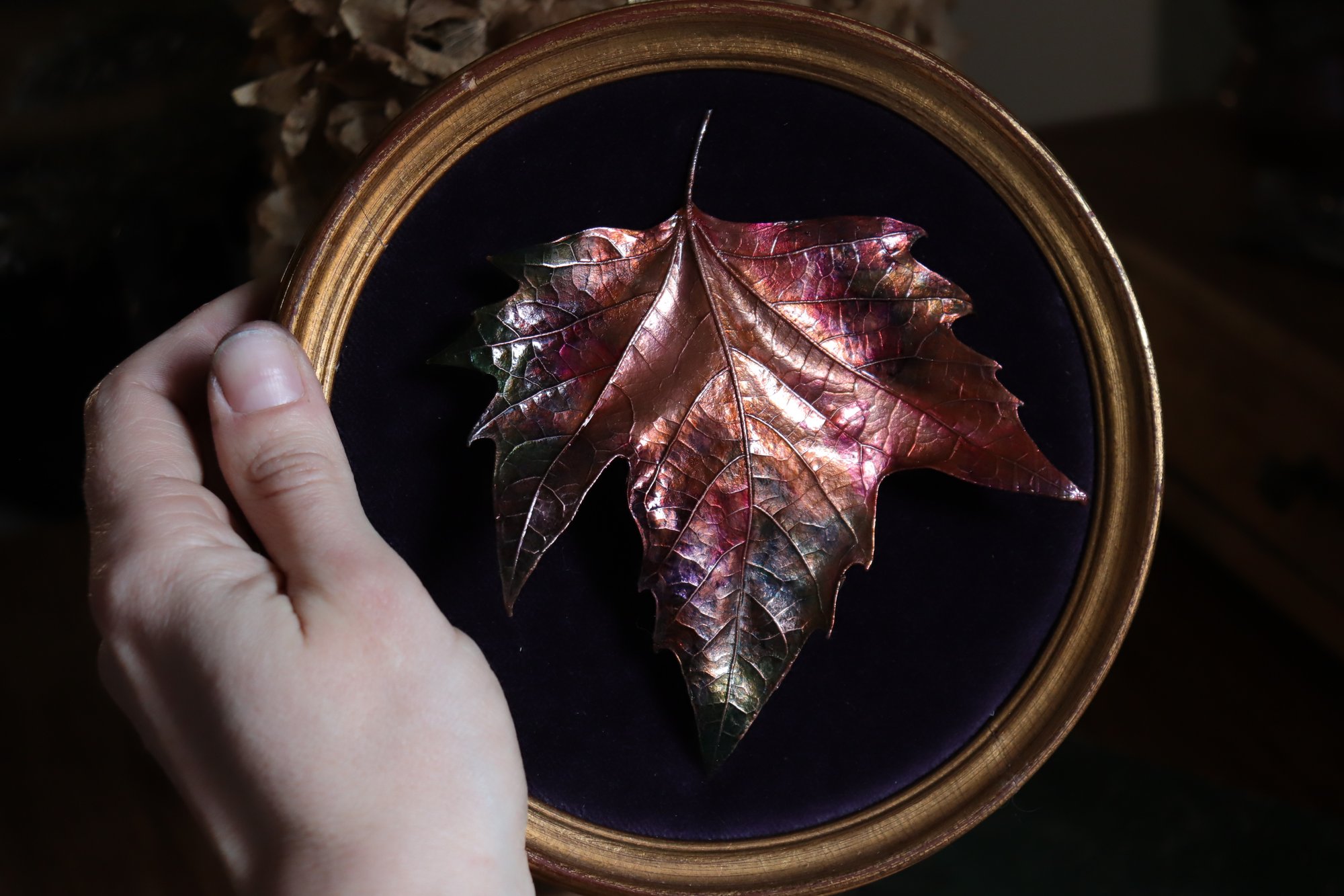 Cornice 8 in legno dorato con foglia maxi di platano acerifolia in rame e retro dark botanico/spooky