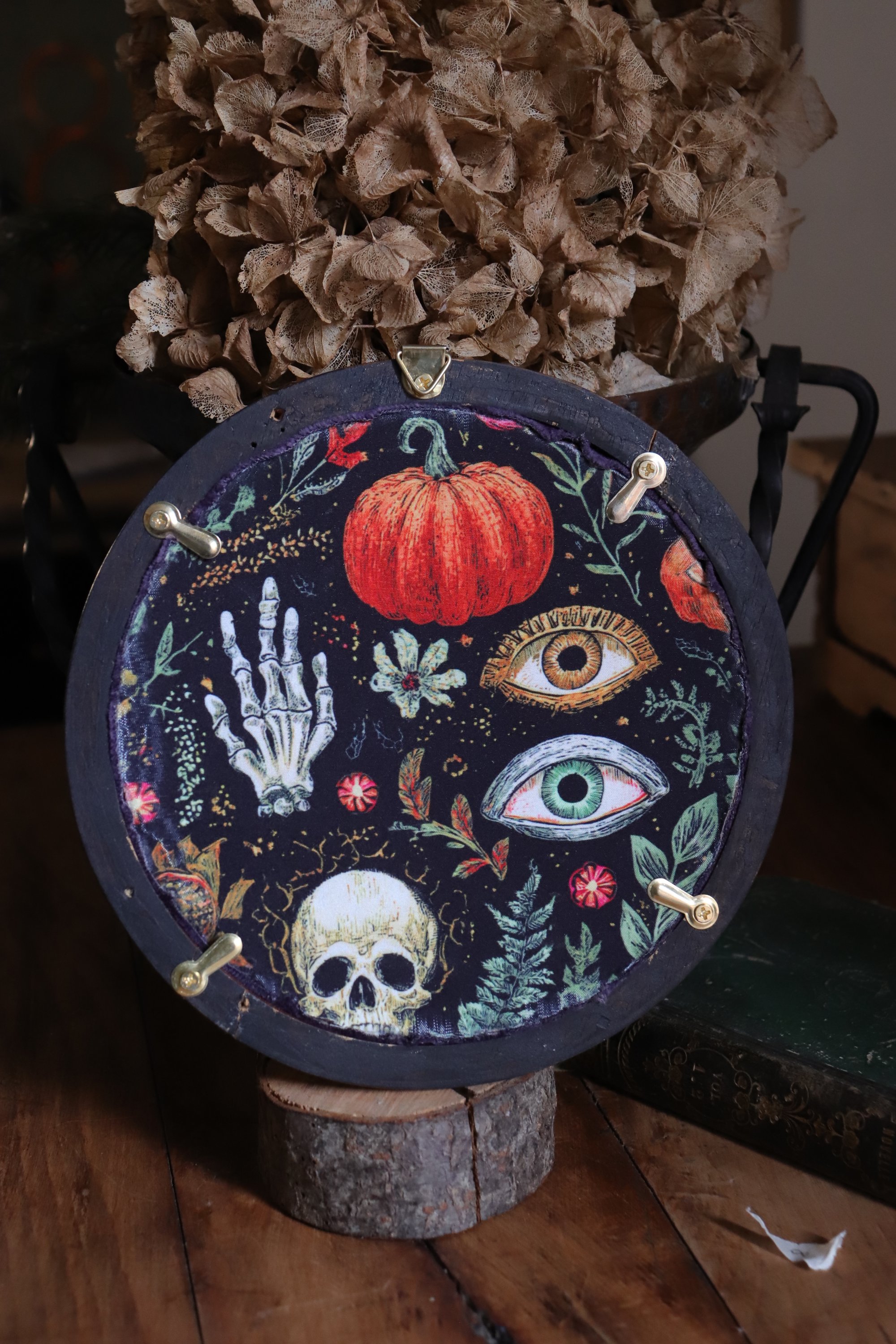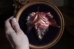 Questa cornice d'antiquariato in legno dorato, restaurata e con applicata sul retro una stoffa in stile dark botanico e spooky (teschio, zucca, mano scheletrica, occhi e elementi botanici astratti su fondo nero), racchiude una grande foglia di platano acerifolia elettroformata in rame, con finitura parzialmente ossidata e dipinta con toni verdi e viola.