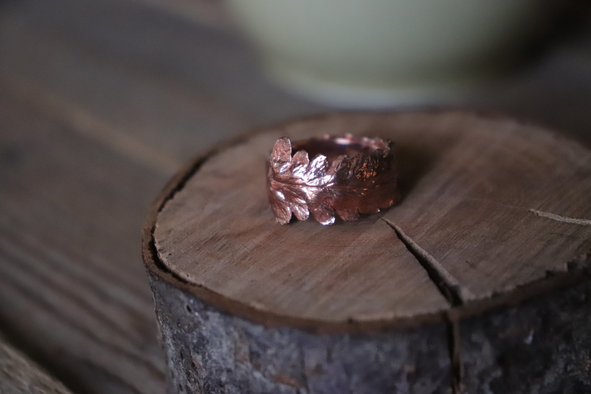 Anello con vero frammento di felce fissato su base ad anello, non regolabile, alta 5 mm ed elettroformato in rame, con finitura brillante.