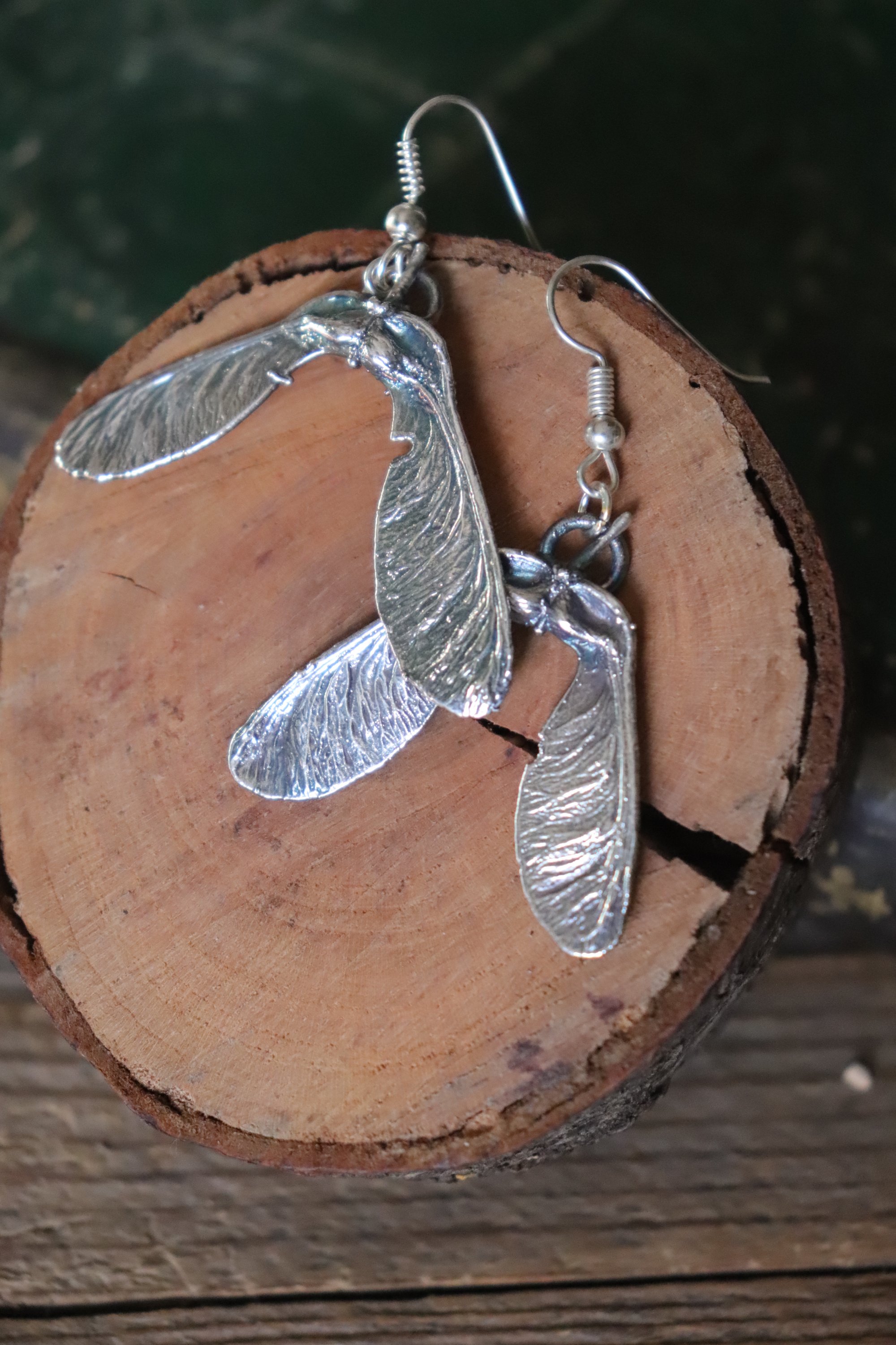 Questi orecchini unici sono stati creati partendo da due metà samare di acero sicomoro, contenute al loro interno, rivestite prima di rame mediante elettroformatura e successivamente placcate in puro argento, poi ossidati e rilucidati. questi orecchini sono molto resistenti ma soprattutto leggeri, quindi non appesantiscono il lobo.