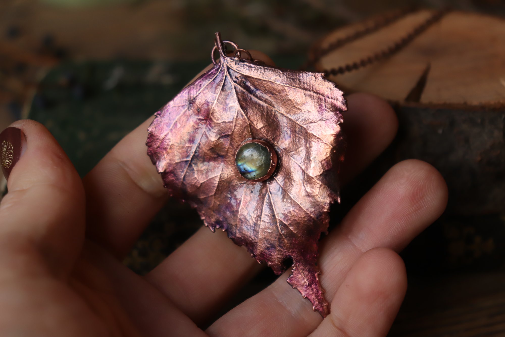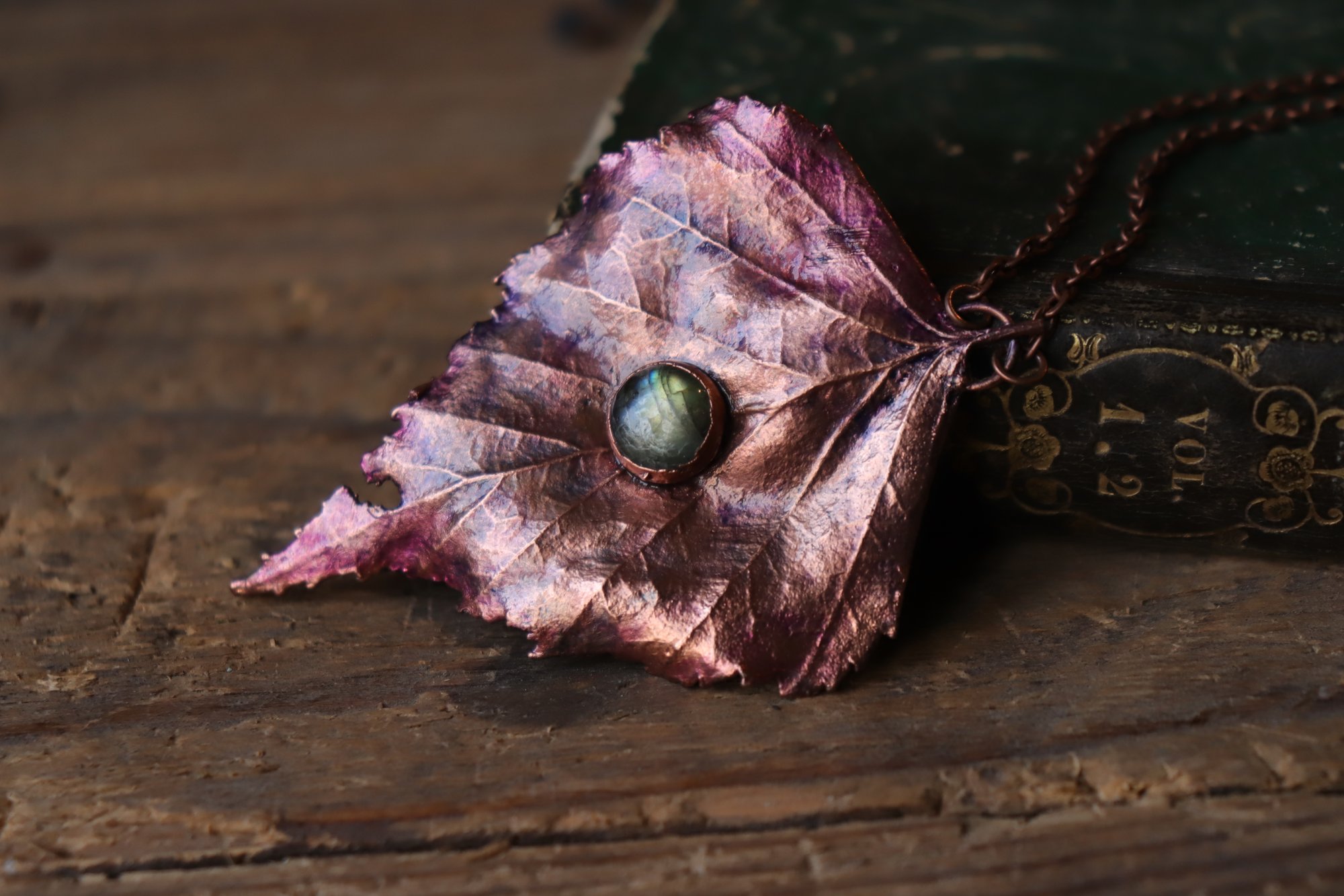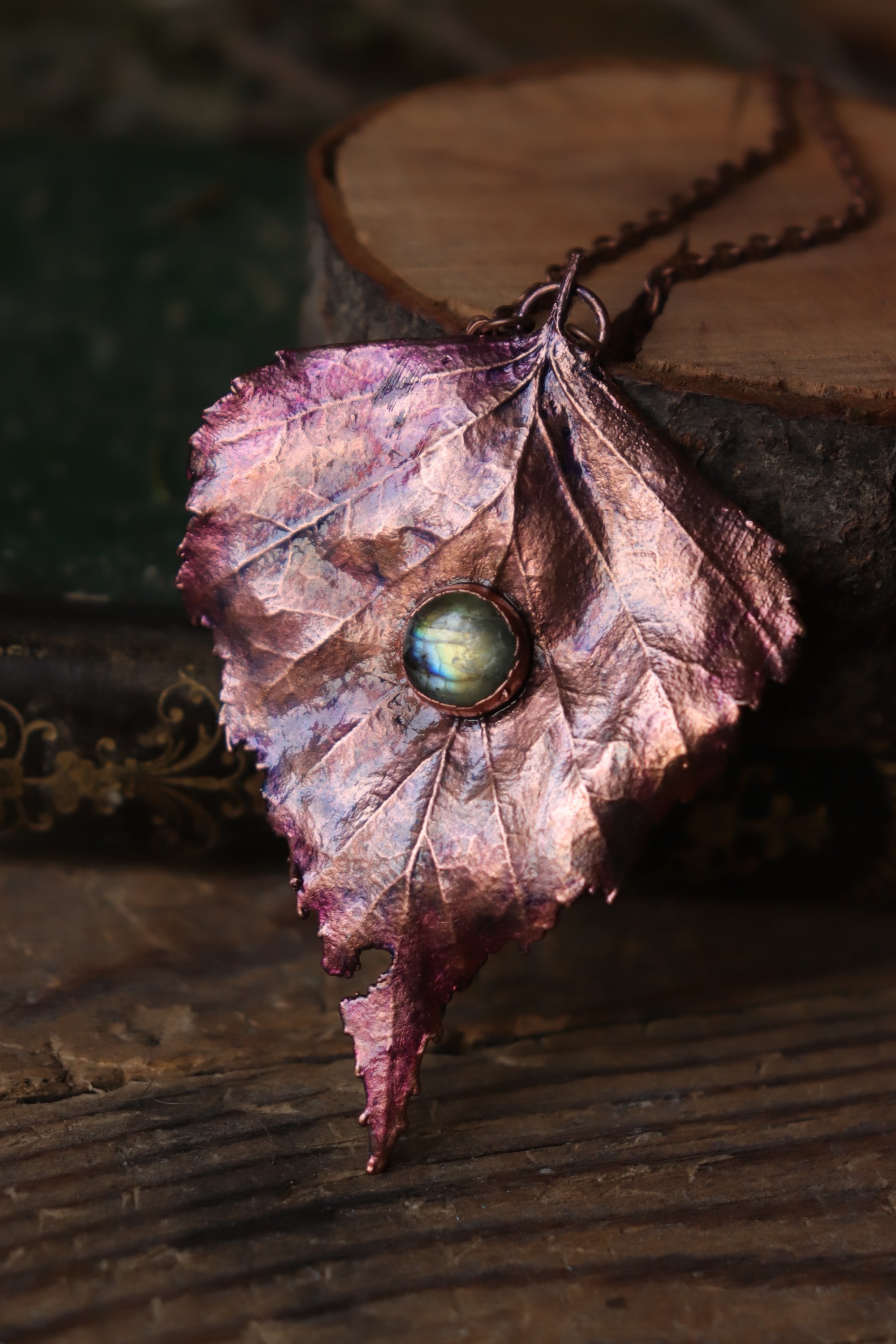 Vera foglia di betulla elettroformata in rame con labradorite e patina violetta