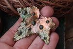Questo gioiello unico è stato creato partendo da una vera foglia di edera, contenuta al suo interno, e rivestita di rame mediante elettroformatura, con nove gocce di resina di diverse dimensioni e forme più o meno regolari a scoprire le venature sottostanti.