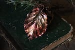 Questo gioiello unico è stato creato partendo da una vera foglia di faggio, contenuta al suo interno, e rivestita di rame mediante elettroformatura.