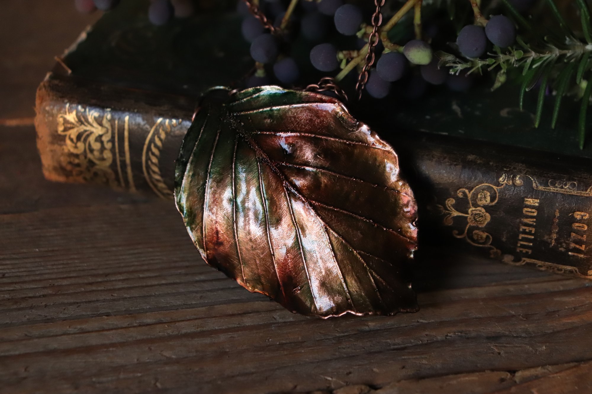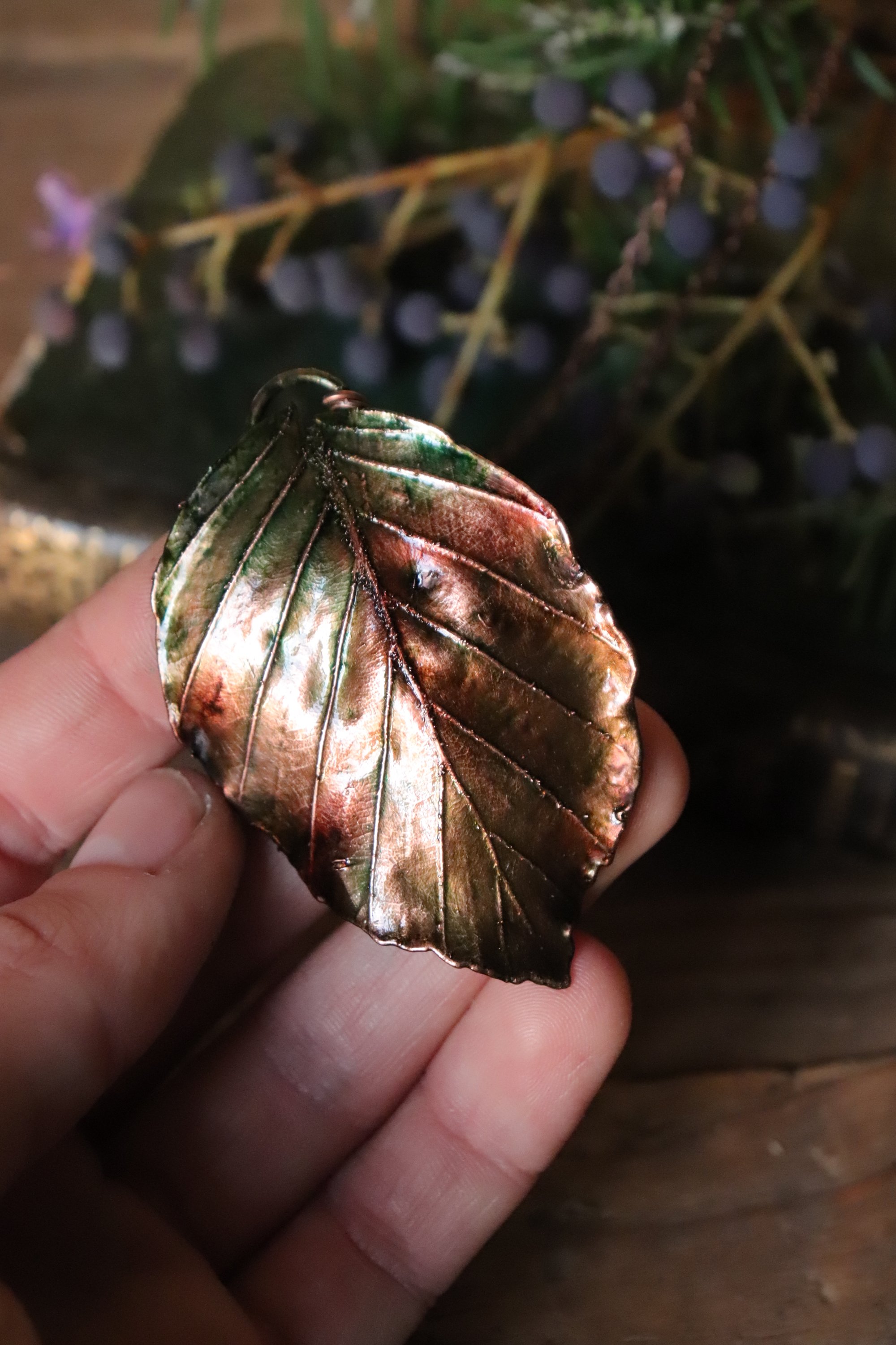 Questo gioiello unico è stato creato partendo da una vera foglia di faggio, contenuta al suo interno, e rivestita di rame mediante elettroformatura.