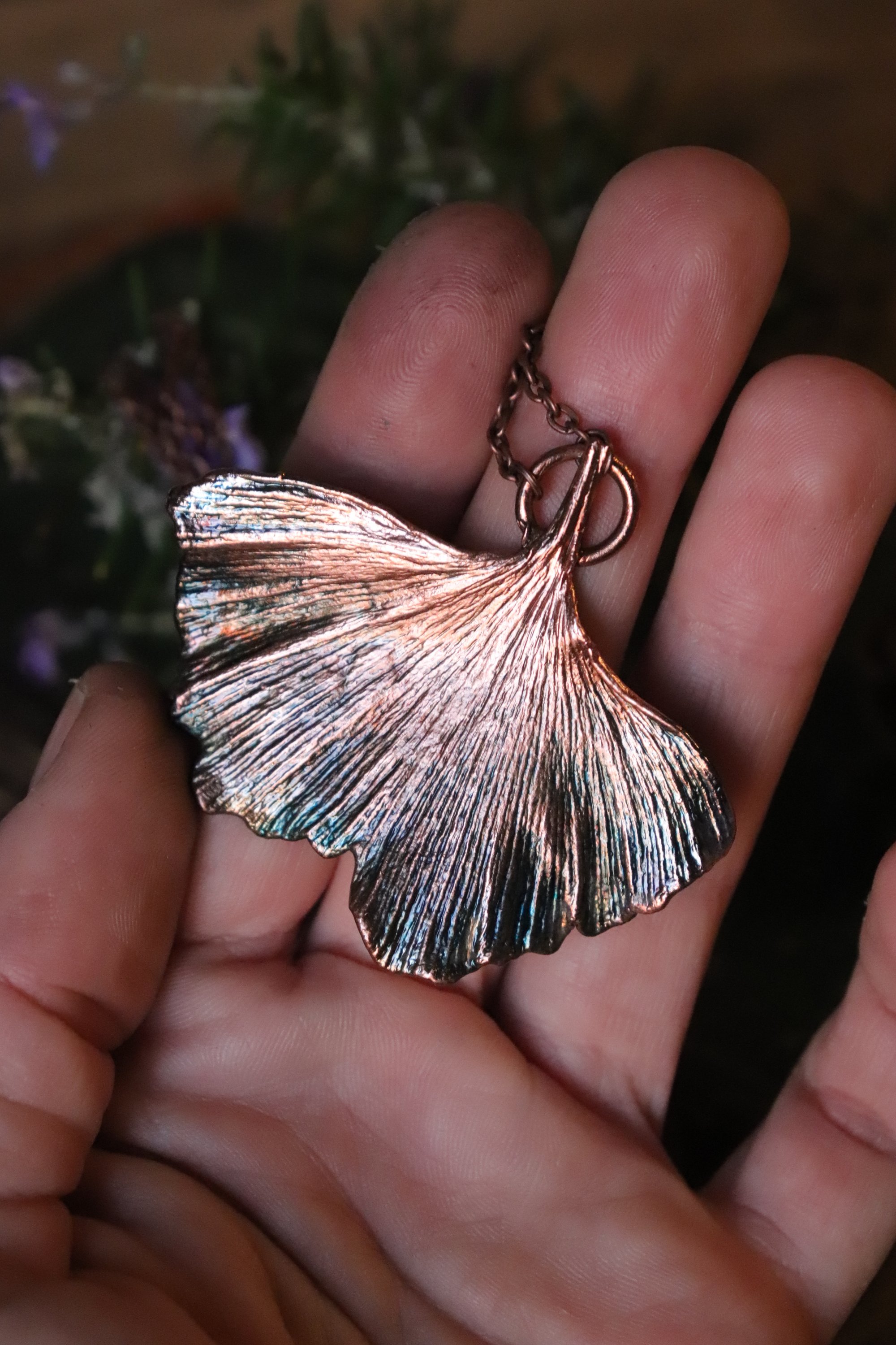 Questo gioiello unico è stato creato partendo da una vera foglia di ginkgo biloba, contenuta al suo interno, e rivestita di rame mediante elettroformatura.