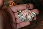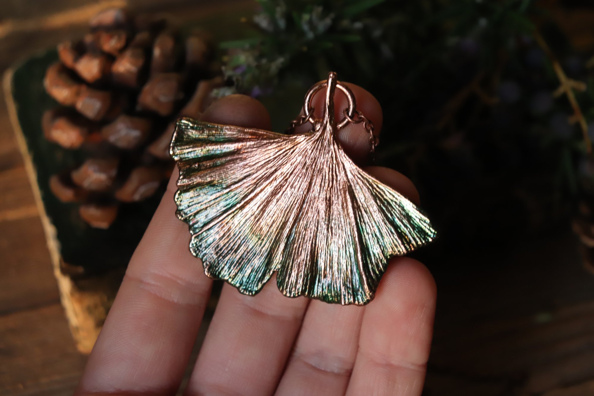 Questo gioiello unico è stato creato partendo da una vera foglia di ginkgo biloba, contenuta al suo interno, e rivestita di rame mediante elettroformatura.