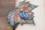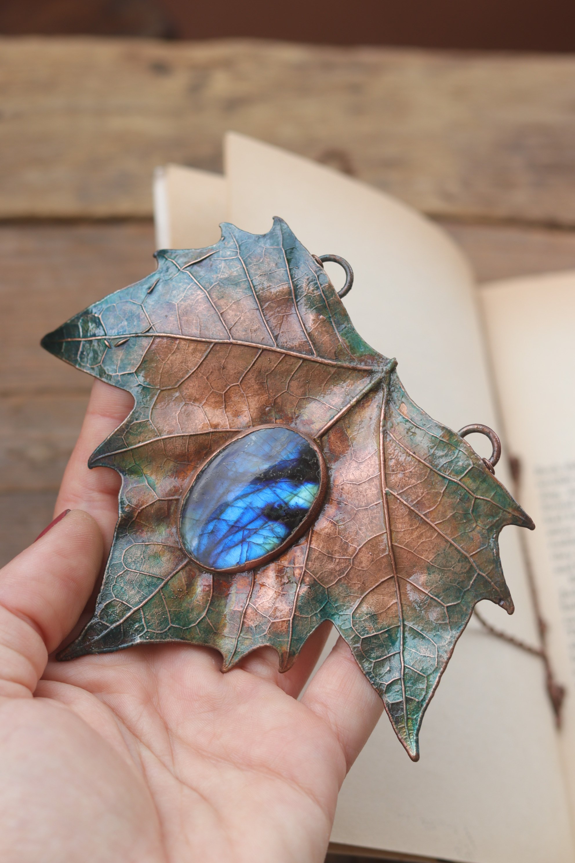Vera foglia di platano acerifolia maxi elettroformata in rame con labradorite blu