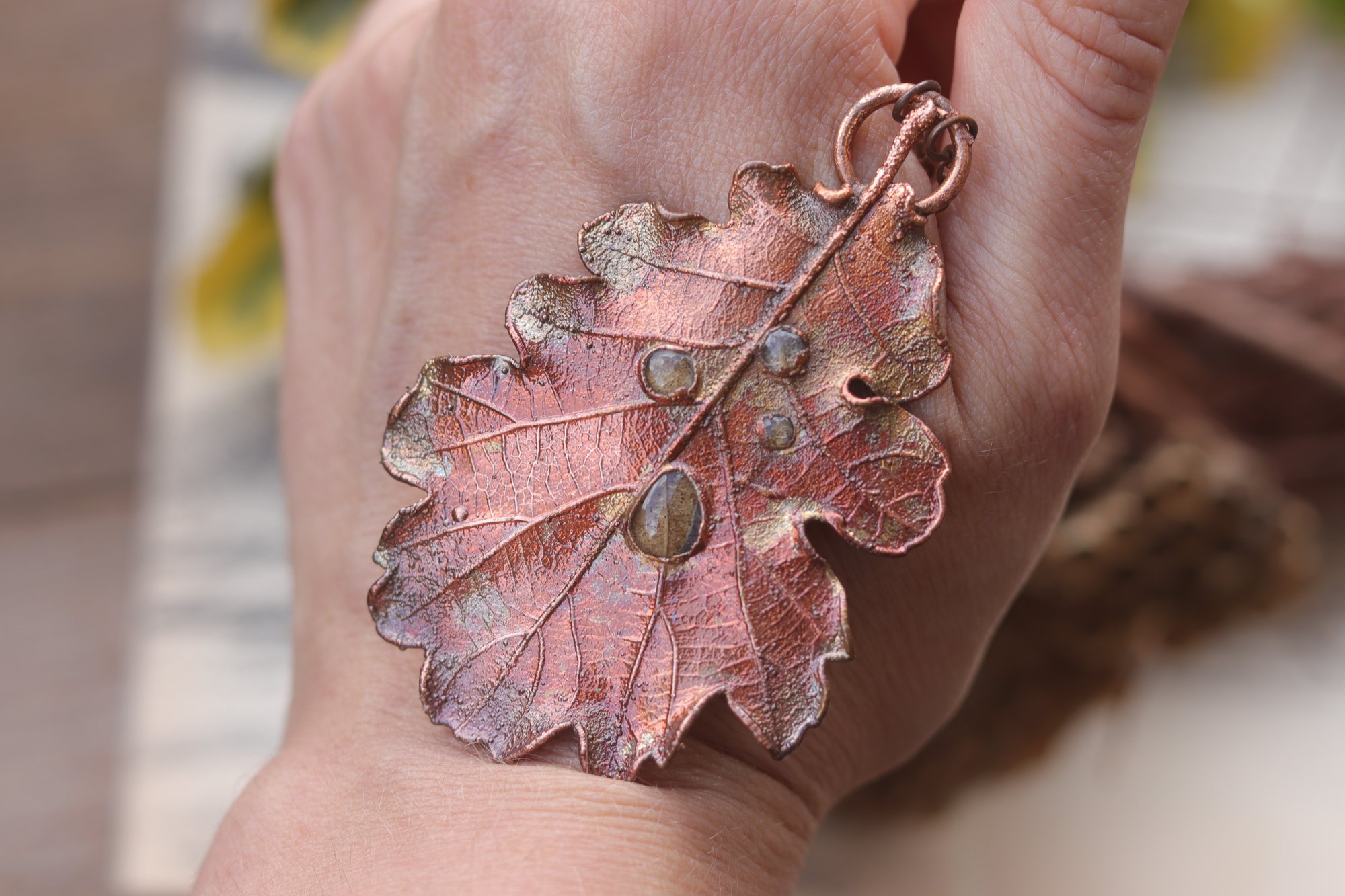 Questo gioiello unico è stato creato partendo da una vera foglia di quercia, contenuta al suo interno, e rivestita di rame mediante elettroformatura, con quattro gocce di resina di diverse dimensioni e forme più o meno regolari a scoprire le venature sottostanti.