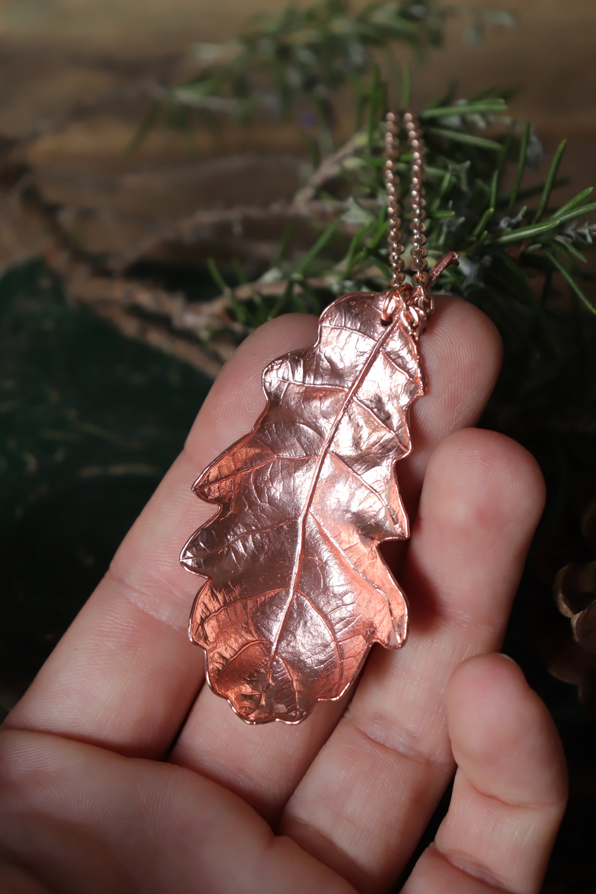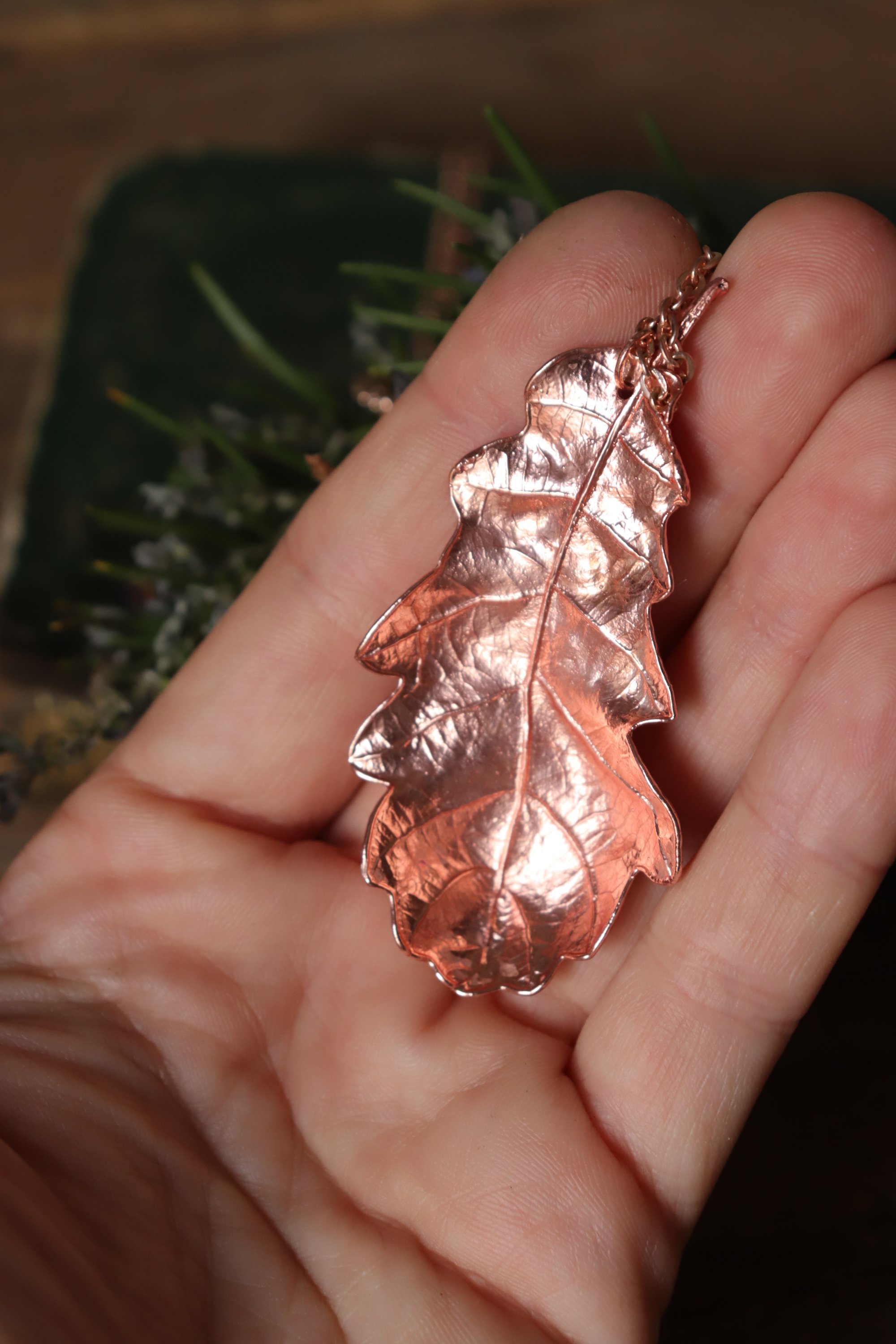 Questo gioiello unico è stato creato partendo da una vera foglia di quercia, contenuta al suo interno, e rivestita di rame mediante elettroformatura.