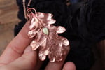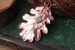Questo gioiello unico è stato creato partendo da una vera foglia di quercia, contenuta al suo interno, e rivestita di rame mediante elettroformatura.
