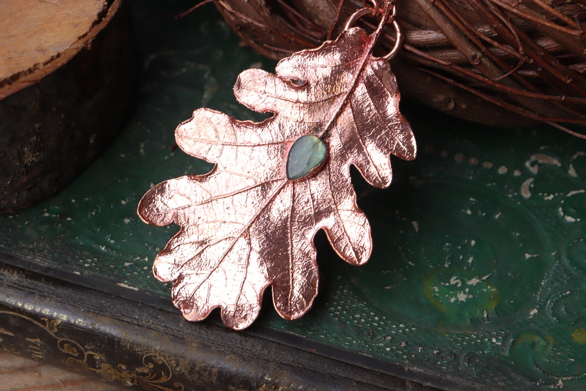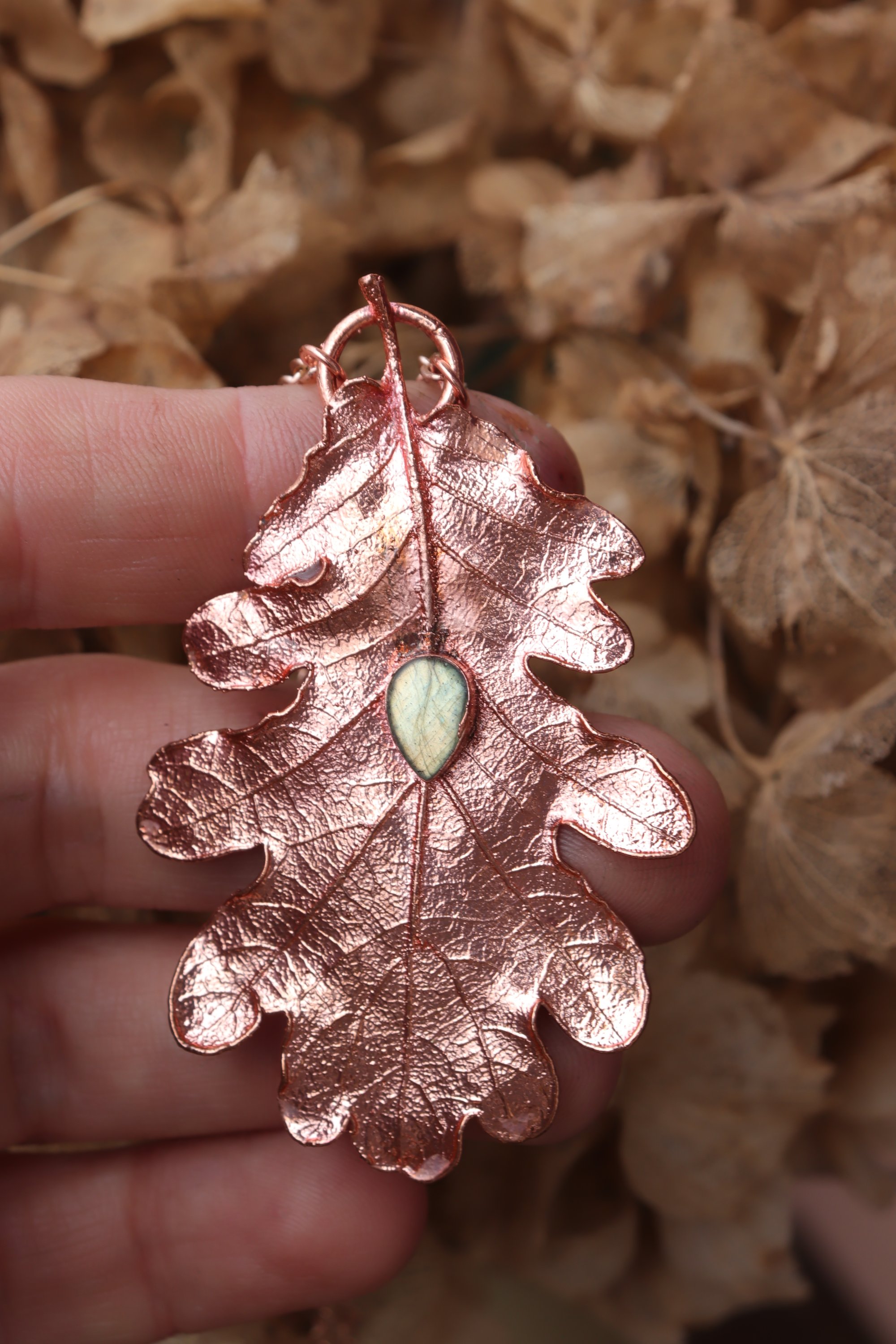 Vera foglia di quercia elettroformata in rame con finitura lucida e labradorite