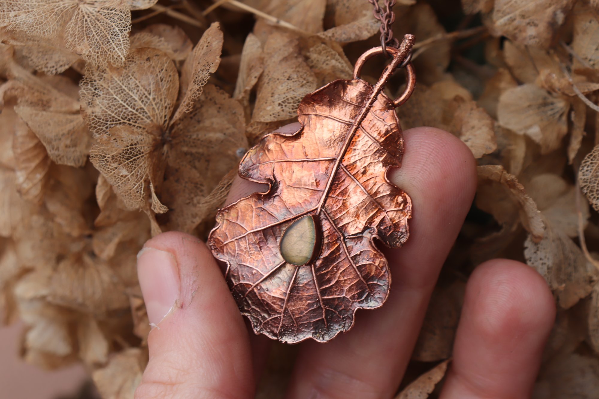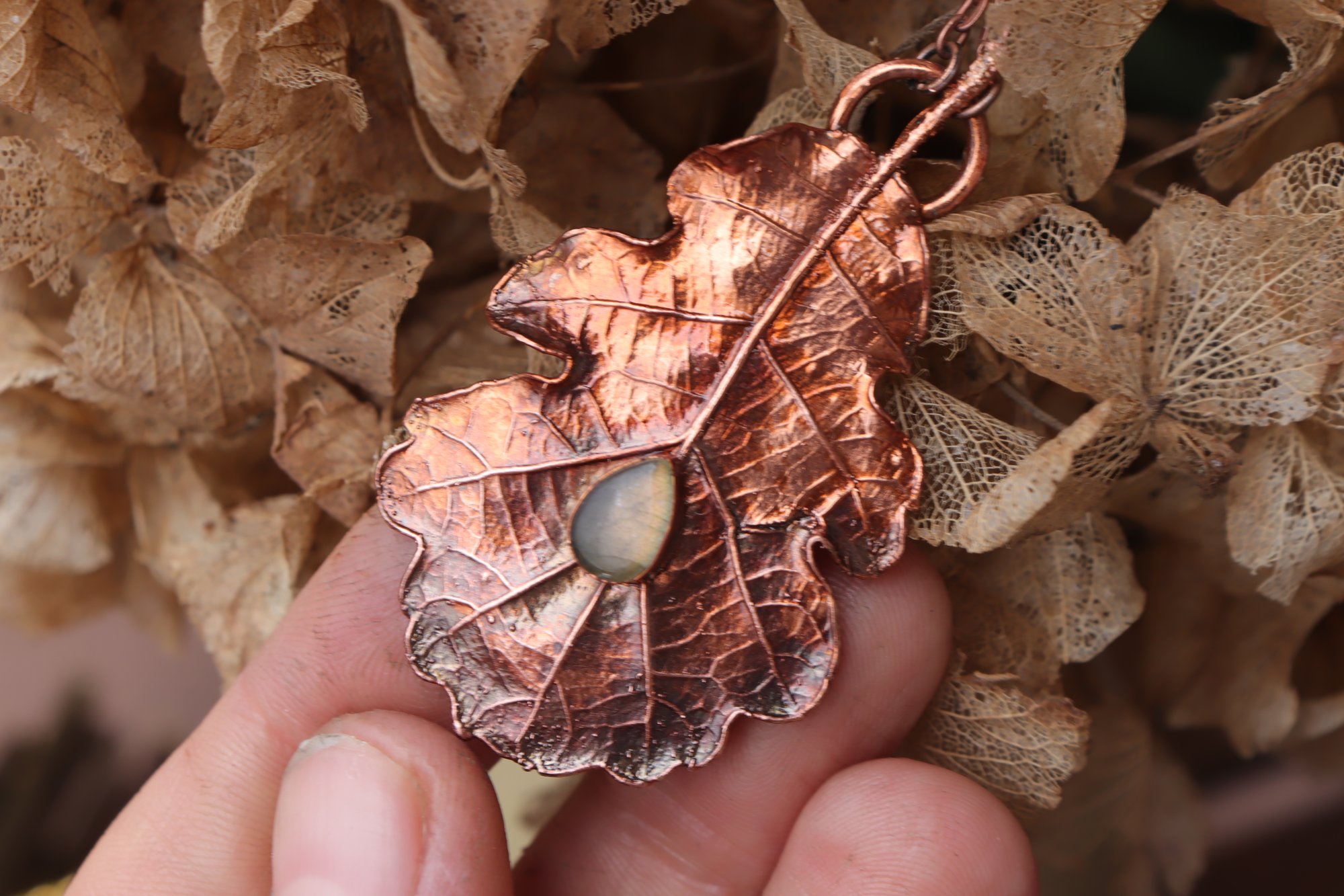 Vera foglia di quercia elettroformata in rame con finitura ossidata e labradorite