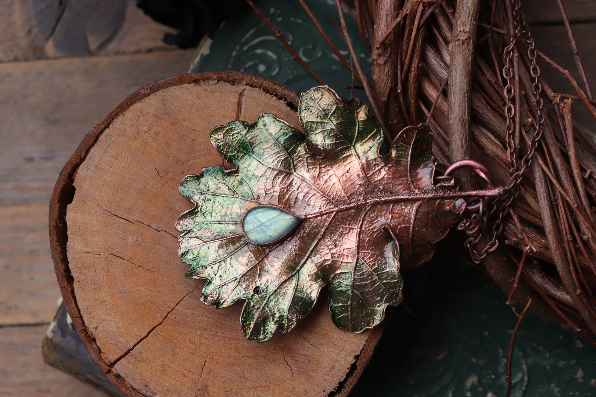 Vera foglia di quercia elettroformata in rame con patina verde e labradorite