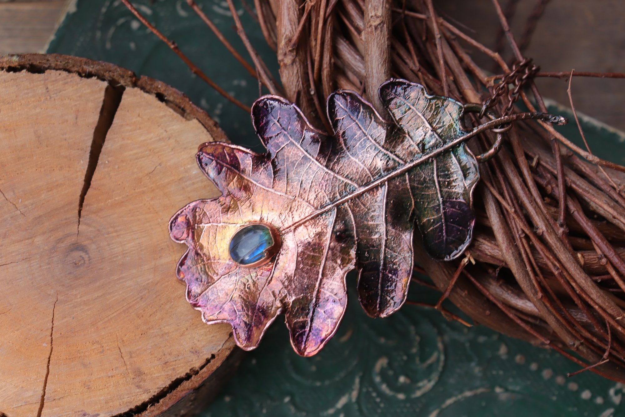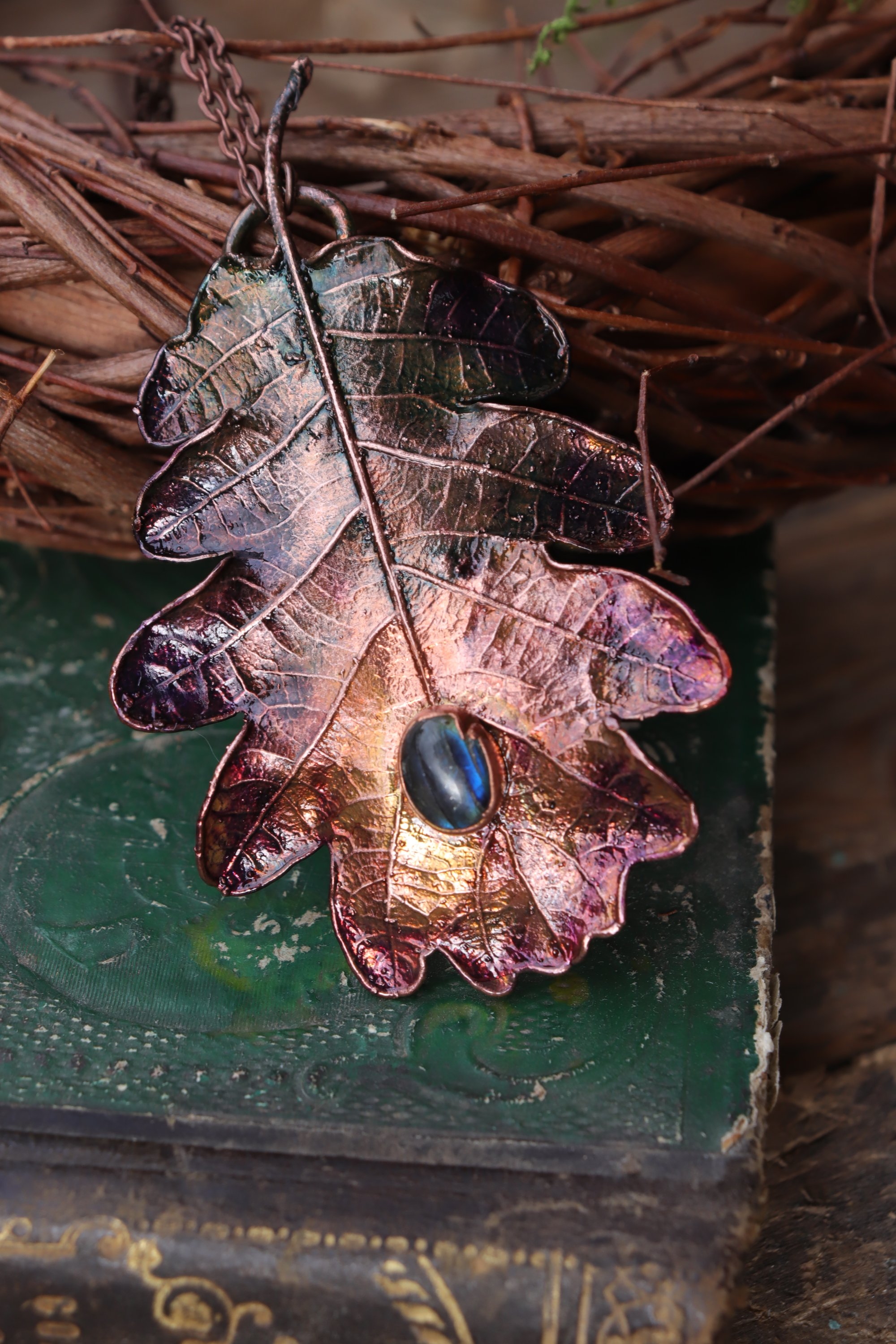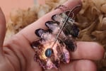 Vera foglia di quercia elettroformata in rame con patina sfumata viole/blu e labradorite