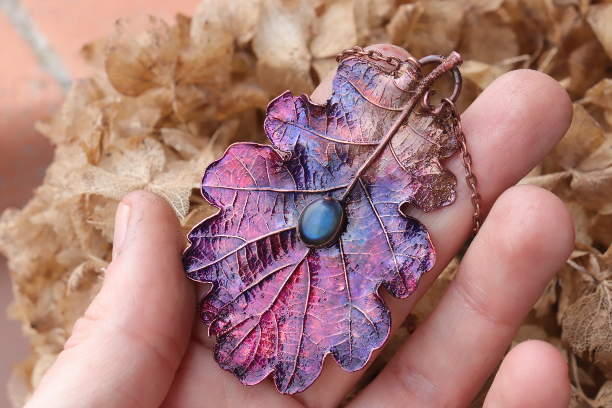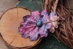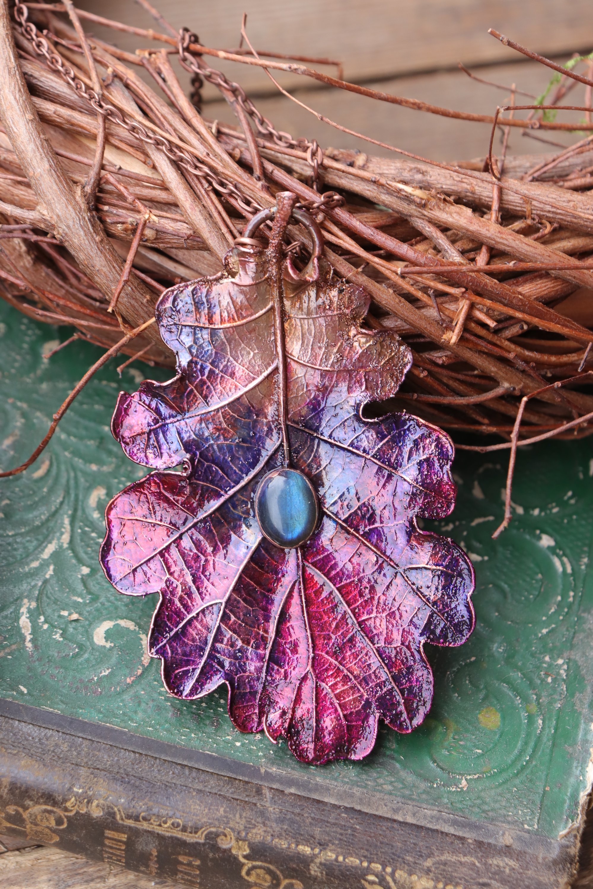 Vera foglia di quercia elettroformata in rame con patina viola e labradorite
