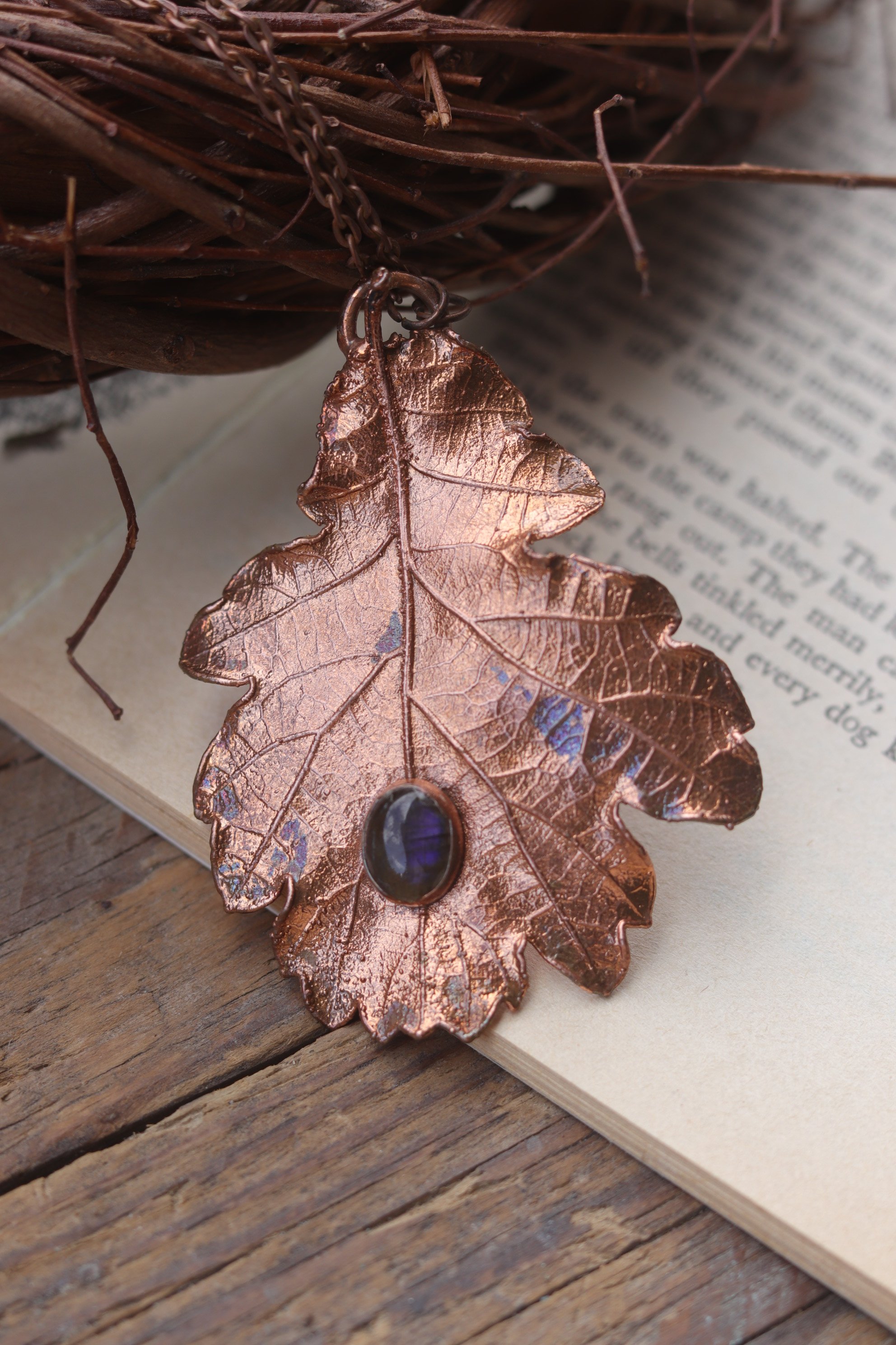 Vera foglia di quercia elettroformata in rame ossidato con labradorite blu 3