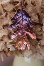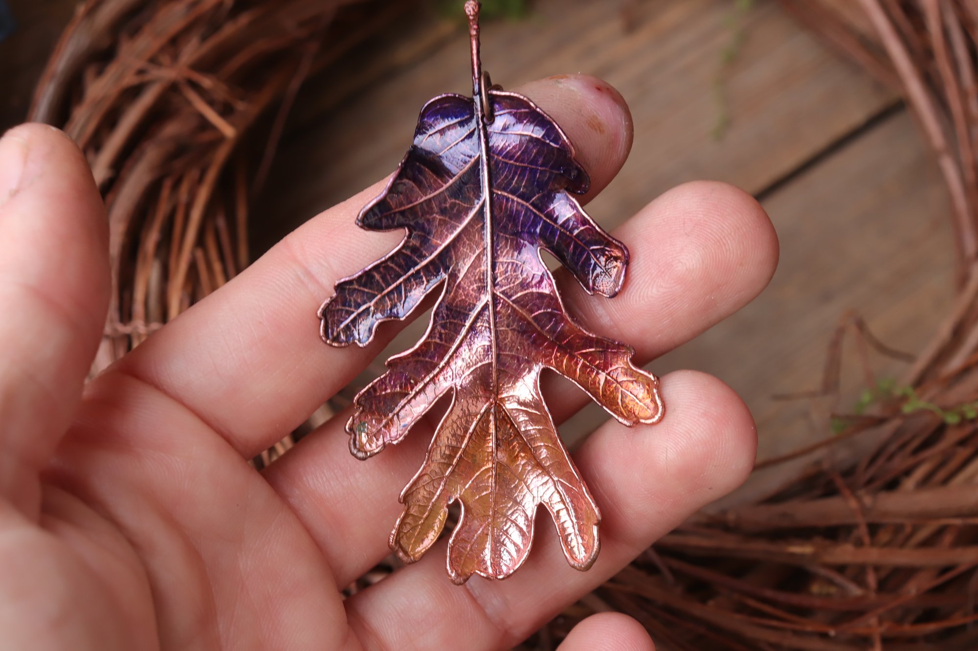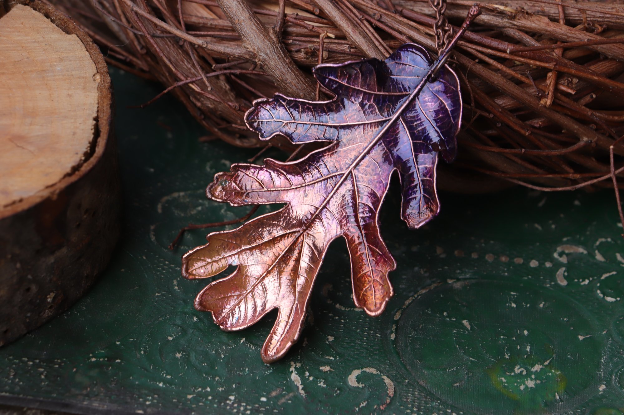 Vera foglia di quercia farnia racchiusa nel rame con patina viola