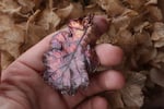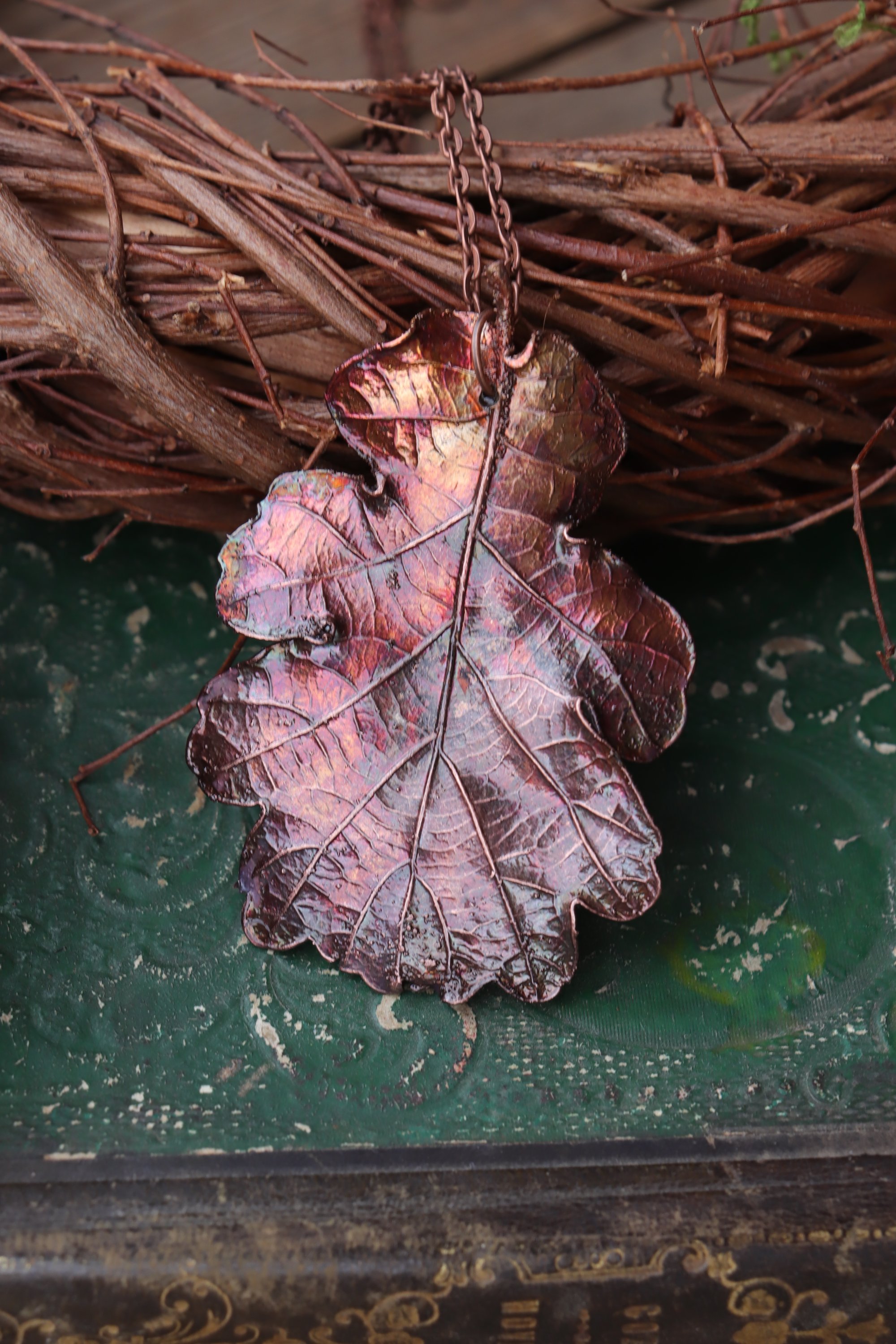 Questo gioiello unico è stato creato partendo da una vera foglia di quercia, contenuta al suo interno, e rivestita di rame mediante elettroformatura.