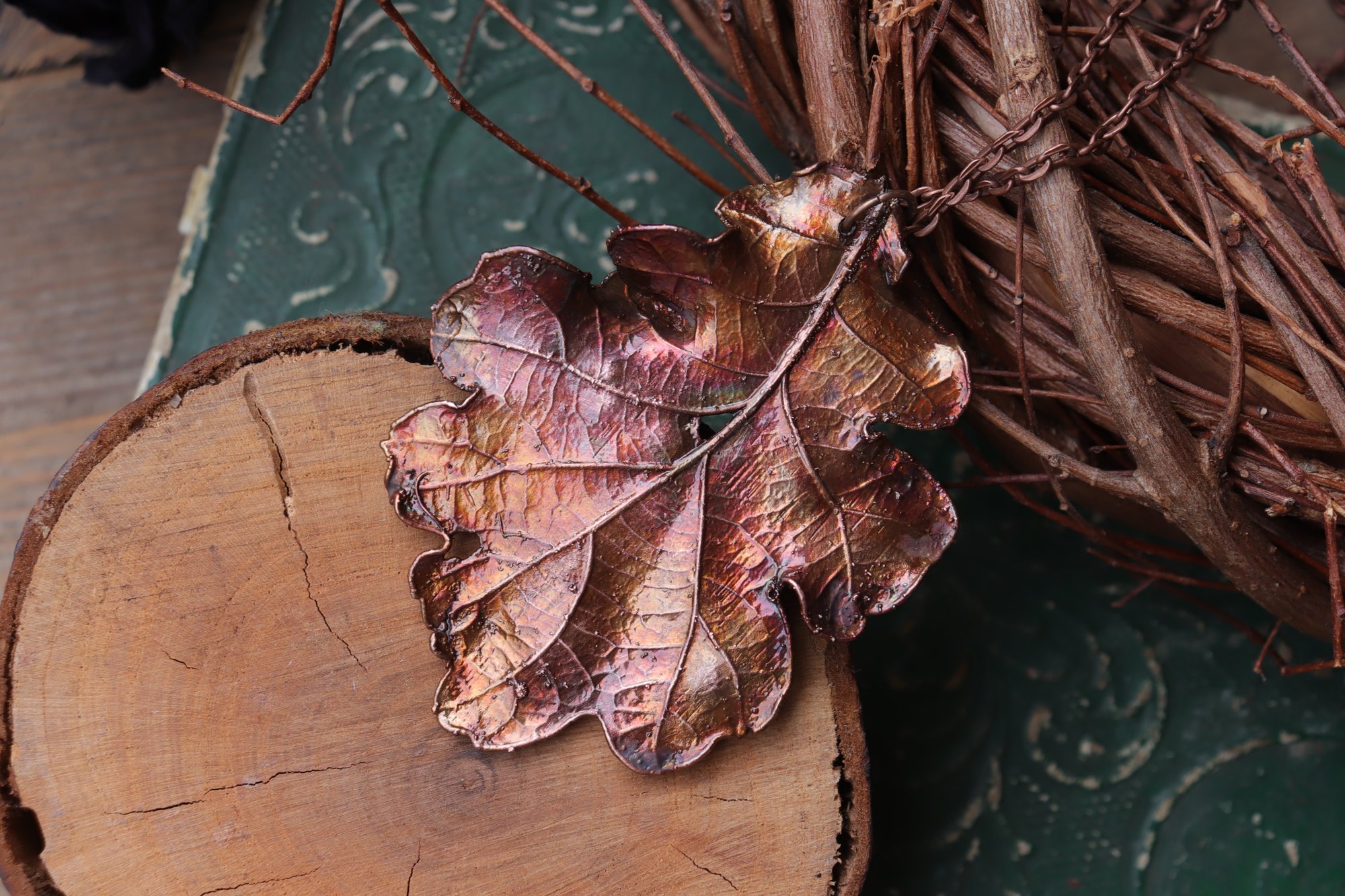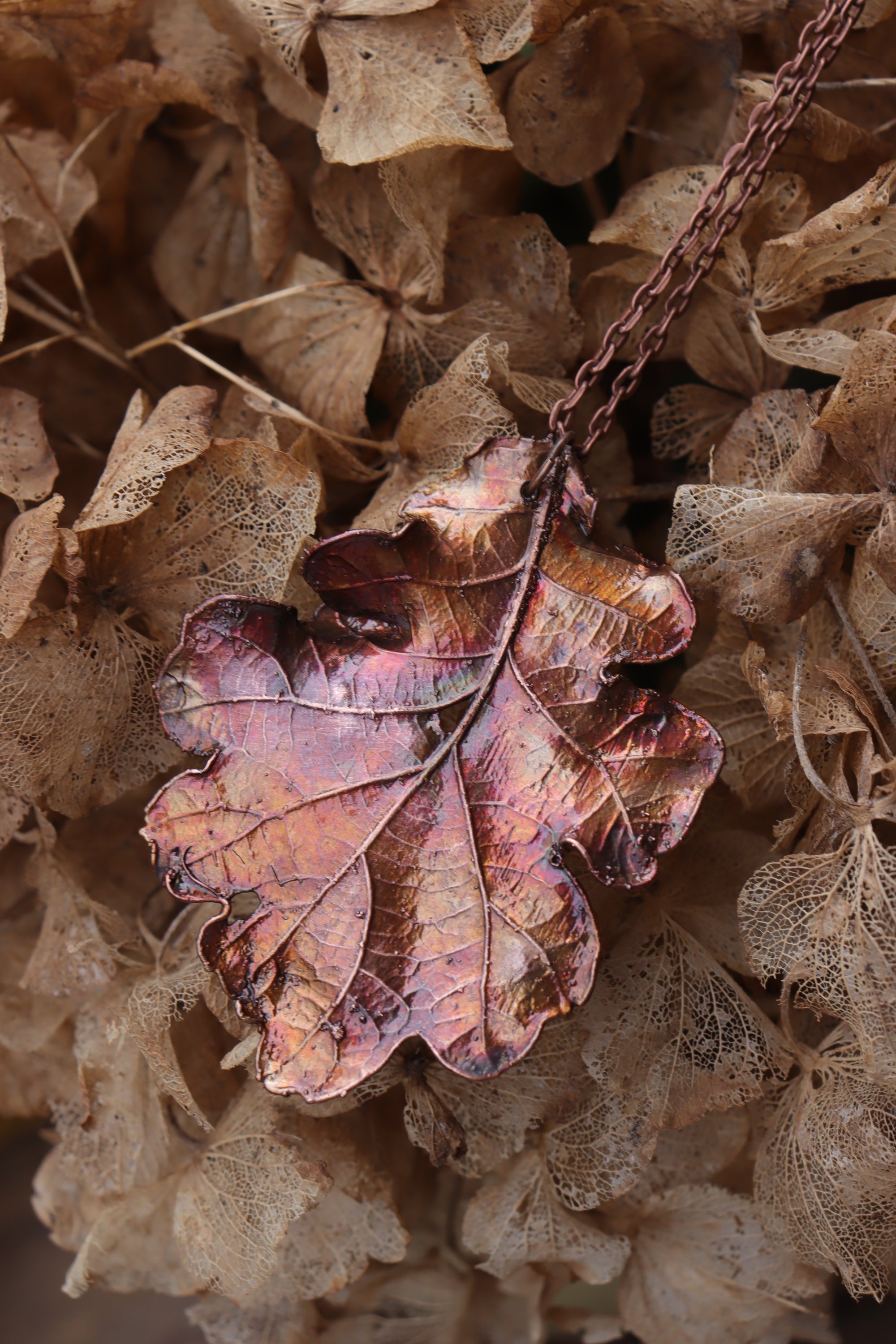 Questo gioiello unico è stato creato partendo da una vera foglia di quercia, contenuta al suo interno, e rivestita di rame mediante elettroformatura.