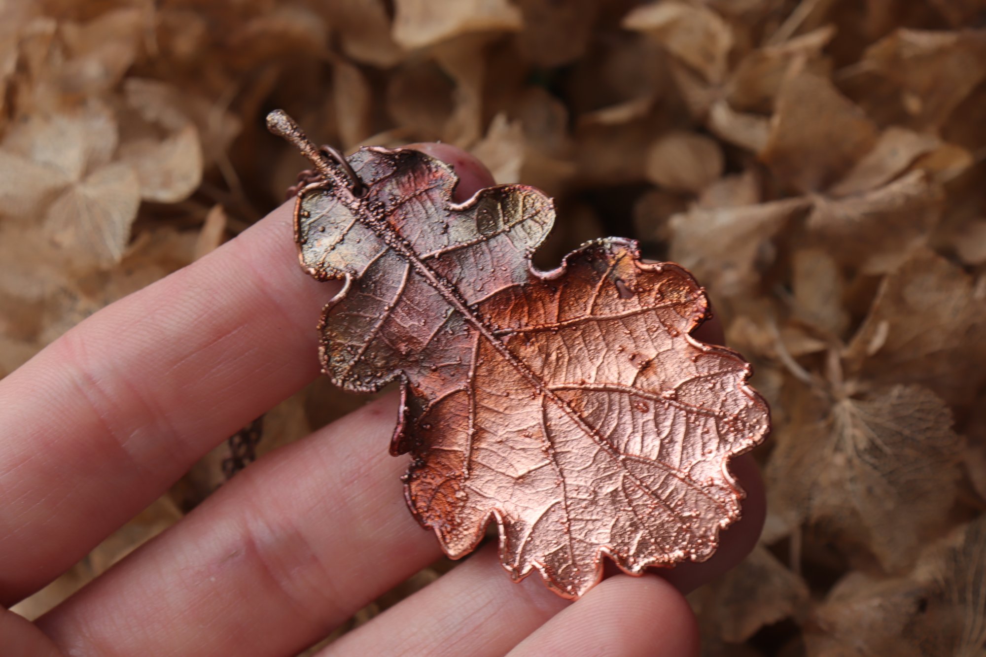 Questo gioiello unico è stato creato partendo da una vera foglia di quercia, contenuta al suo interno, e rivestita di rame mediante elettroformatura.