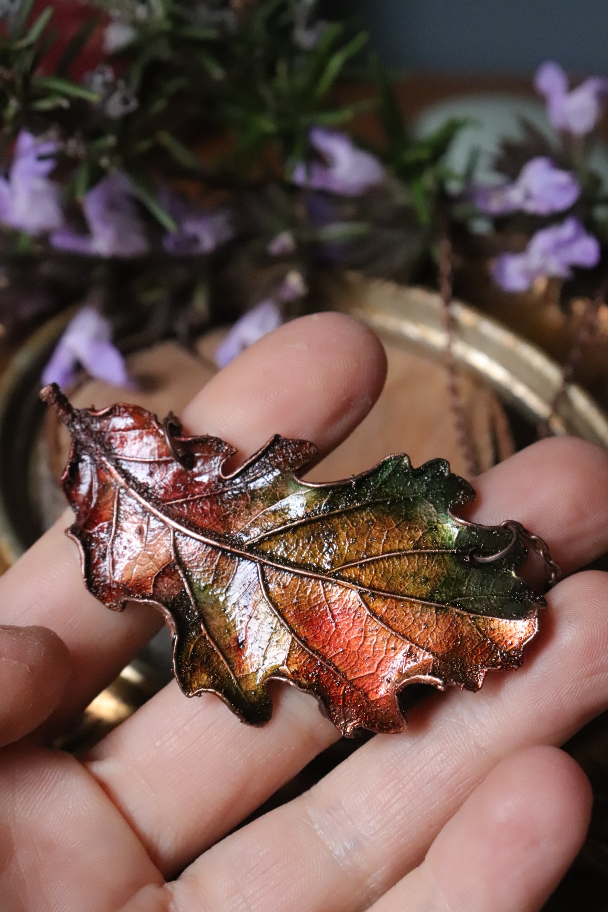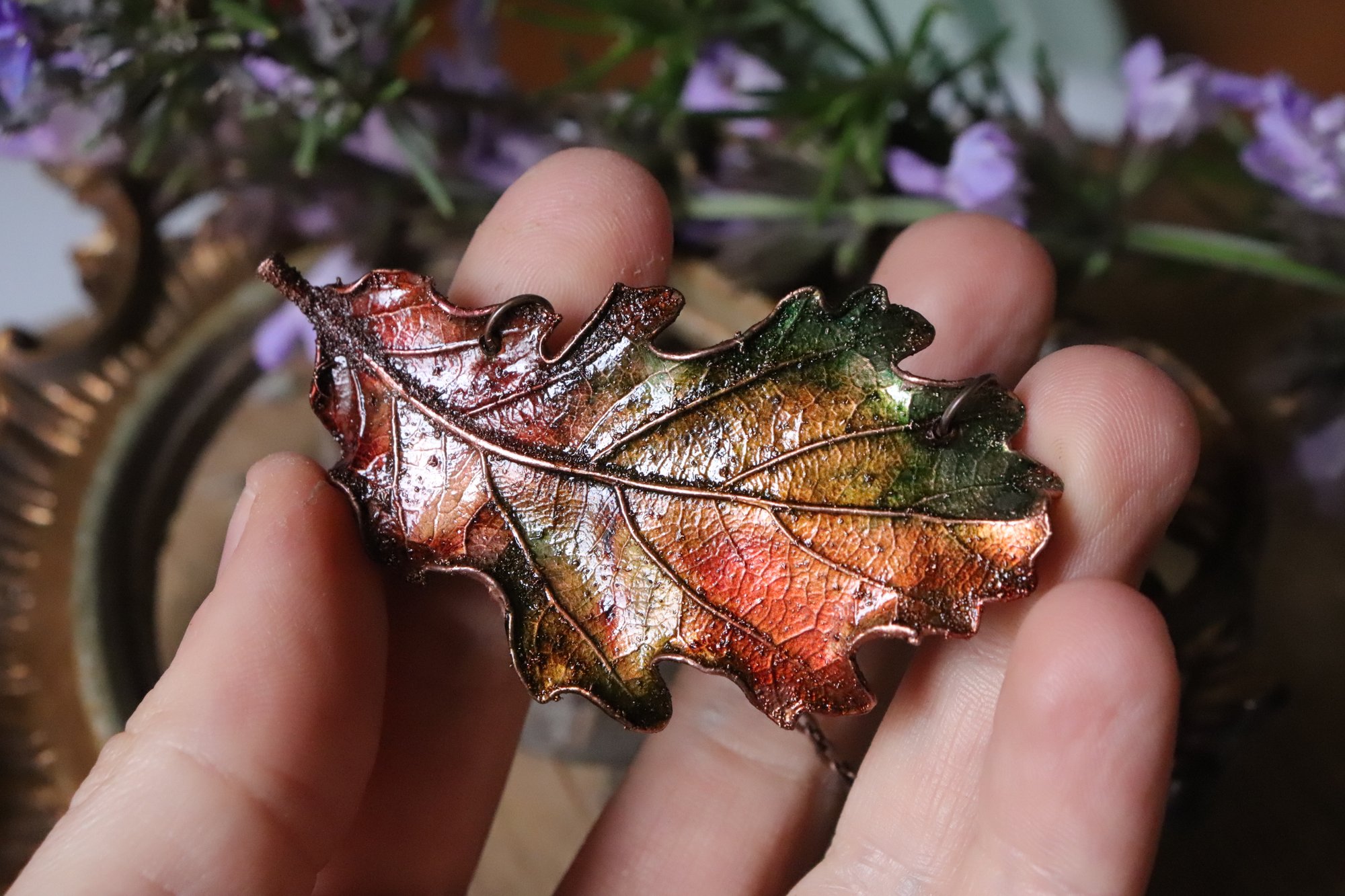 Questo gioiello unico è stato creato partendo da una vera foglia di quercia, contenuta al suo interno, e rivestita di rame mediante elettroformatura.