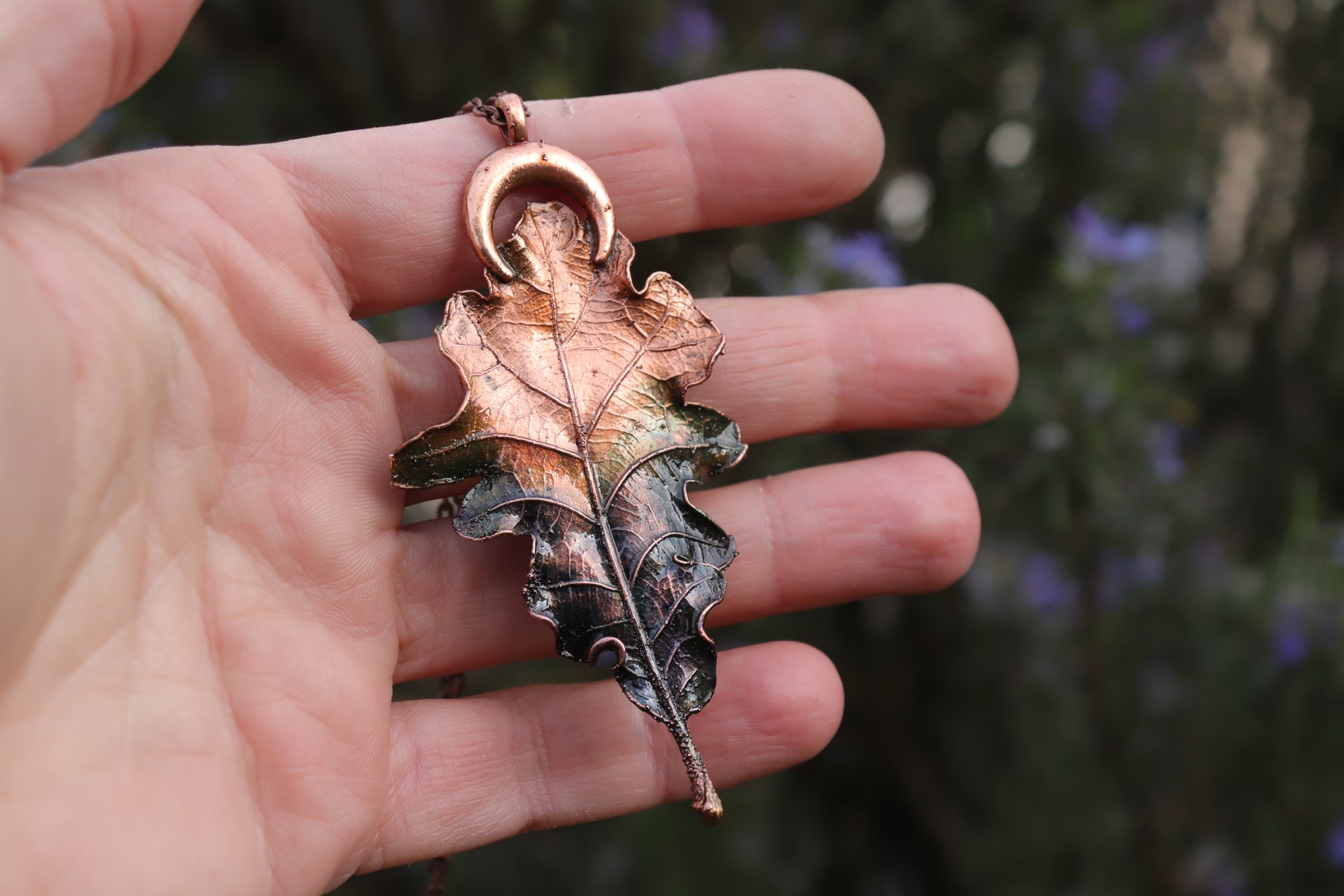 Collana con vera foglia di quercia racchiusa nel rame con patina sfumata teal e luna decorativa