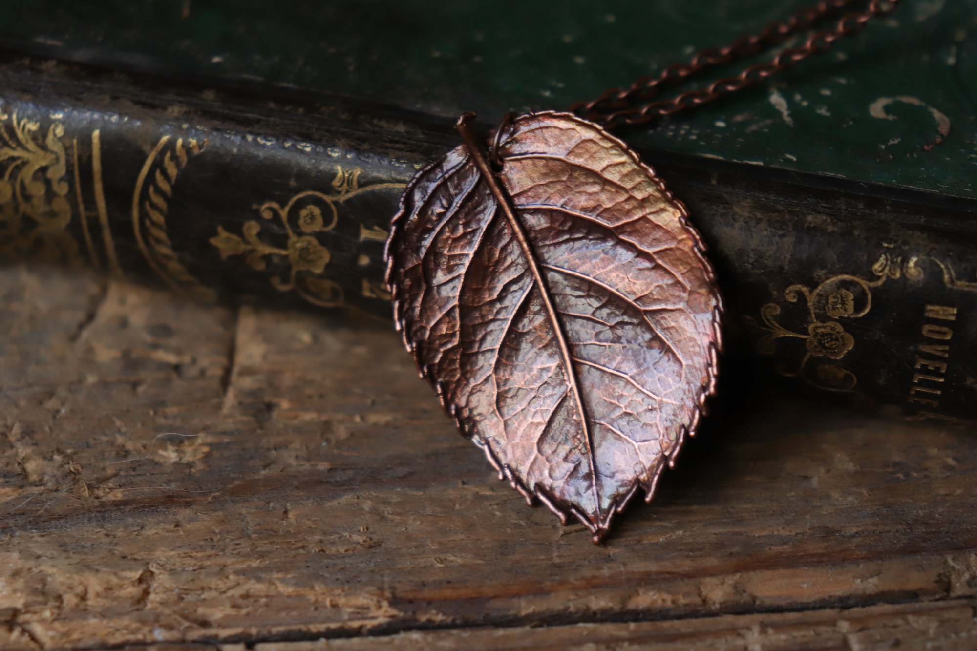 Questo gioiello unico è stato creato partendo da una vera foglia di rosa, contenuta al suo interno, e rivestita di rame mediante elettroformatura.