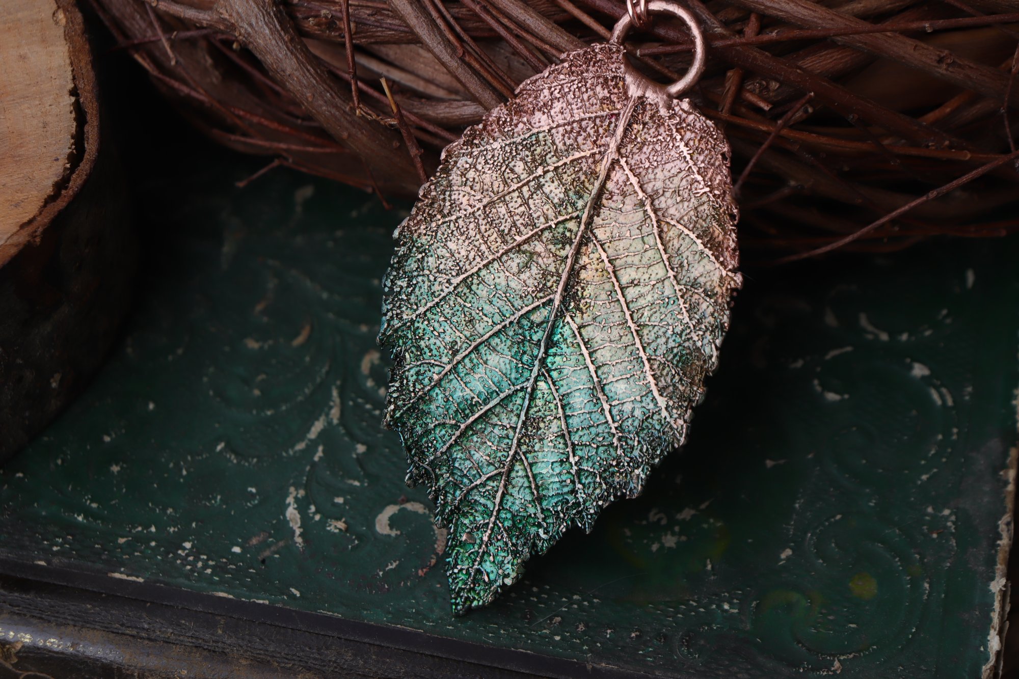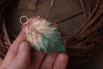 Questo gioiello unico è stato creato partendo da una vera foglia di rovo, contenuta al suo interno, e rivestita di rame mediante elettroformatura.