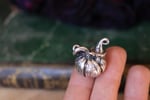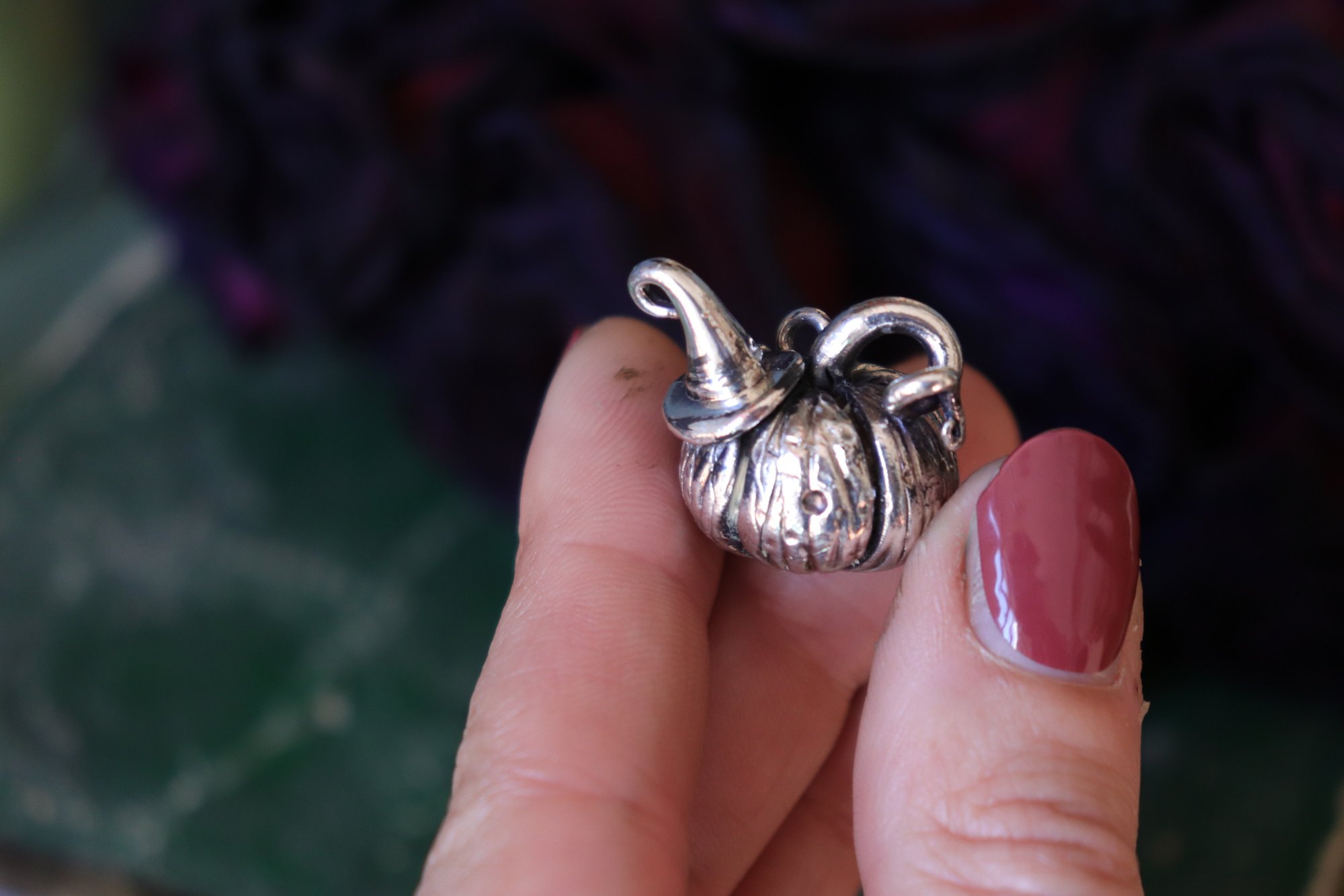 Questo gioiello con piccola zucchetta con cappellino da strega, d'ispirazione autunnale, è stato modellato interamente a mano e poi elettroformato e rivestito in argento.